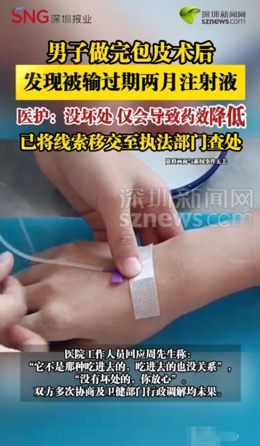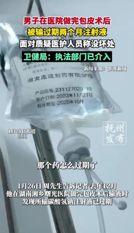 “严查到底!”2025年12月,湖南湘乡,一男子当地医院做完包皮手术后输液时,竟无意间发现护士给自己所输的碳酸氢钠注射液,有效期竟至2025年10月,已过期整整两个月!可医护人员的却说不会致命,只是药效差一些。网友:打针不就是为了药效吗? 事发当天,周先生(化名)在湘乡当地一家医院接受了包皮手术。 手术结束后,医生告知他前列腺存在一些问题,需要通过输液进行进一步的治疗和消炎。 对于医生的安排,周先生没有丝毫怀疑,毕竟术后消炎是常规操作,他只想着好好配合治疗,尽快恢复健康,早日摆脱病痛的困扰。 术后的几天里,周先生一直按时在医院接受输液护理,一切看似都在正常进行。 直到输注第二瓶液体时,闲着无事的他下意识地看了一眼手边的药瓶,这一看,瞬间让他惊出了一身冷汗,原本放松的心情瞬间被恐慌和愤怒取代。 药瓶标签上清晰地印着,这瓶碳酸氢钠注射液的生产日期是2023年11月27日,有效期至2025年10月,而当时已经是12月下旬,也就是说,这瓶被直接输注到他体内的药品,已经过期了整整两个月。 一瓶过期两个月的药品,竟然被医护人员毫无顾忌地用到了刚做完手术、身体还十分虚弱的患者身上,周先生越想越后怕,他立刻叫停了输液,匆忙找到当班的医护人员,急切地提出了自己的质疑,诉说着自己的担忧,生怕这瓶过期药品会对自己的身体造成不可挽回的伤害。 可让周先生万万没有想到的是,面对他的焦急与恐慌,医护人员的反应却十分冷淡,没有丝毫的歉意和重视,甚至连一句像样的解释都没有。 他们轻描淡写地告诉周先生,这款碳酸氢钠注射液属于冲洗类药物,就算过期了也没什么坏处,不会对人体造成致命伤害,顶多就是药效稍微差一点,让他不用太过担心,安心输液就好。 这样的回应,无疑是火上浇油,让本就愤怒的周先生更加无法接受。 我实在无法理解,医护人员怎么能说出这样不负责任的话——药品的保质期从来都不是摆设,而是一道守护人体健康的安全防线,过期药品本身就是不合格产品,无论是什么类型的药品,都不应该被投入使用。 医护人员口中的“不会致命”,看似是简单的安慰,实则是对患者生命健康的漠视,更是对医疗行业职业操守的亵渎,患者来医院是为了康复,不是来承受这种不必要的风险的。 尽管心里充满了不满和担忧,但在医护人员的敷衍回应下,周先生无奈之下还是输完了那瓶过期药品。 可当天下午,他就感觉到了身体的不适,身上开始冒出密密麻麻的红疹,还伴随着强烈的瘙痒感,他当即怀疑,这是输注过期药品引发的过敏反应。 为了确保自己的身体安全,周先生不敢有丝毫耽搁,立刻前往另一家医院进行了全面检查。 好在检查结果显示,只是轻微的过敏反应,并没有造成更严重的身体伤害,休息一段时间后就能恢复,这才让他稍微松了一口气,但心里的后怕和愤怒,却丝毫没有减少。 刚做完手术,本就需要安心休养,可因为这瓶过期药品,周先生不仅身体上遭受了额外的痛苦,精神上也备受折磨,日夜提心吊胆,担心自己的身体会留下后遗症,对涉事医院的信任,也瞬间崩塌殆尽。 他觉得,医院必须给自己一个合理的说法,弥补自己所遭受的身心伤害。 随后,周先生回到了涉事医院,找到了医院负责人,提出了自己的诉求。 他最初提出了5万元的赔偿,其中包括医疗费、误工费和精神损失费,但这其实只是一句气话,他真正想要的,从来都不是金钱,而是医院的一个诚恳态度,是对自己健康的重视,是一句发自内心的道歉,还有一次全面的身体检查,确保自己没有受到隐藏的伤害。 可让周先生再次失望的是,涉事医院的态度十分强硬,不仅没有丝毫的歉意,还直接拒绝了他的赔偿诉求。 医院表示,不会承担5万元的赔偿,最多只能支付8000元的人道主义赔偿,还声称,他们的行为并没有给周先生造成实质性的伤害,这8000元已经不少了。 更让人寒心的是,面对周先生提出的、希望医院带自己去上级医院做全面检查、并在媒体上公开道歉的合理诉求,医院也予以拒绝,甚至还故意刁难周先生,让他提供自己身体受损的相关依据,或者通过法律途径解决纠纷。 在此期间,医院既没有安排工作人员来看望过正在住院的周先生,也没有主动提出为他做任何身体检查,态度冷漠到了极点。 看着医院这种不负责任、敷衍了事的态度,周先生彻底寒心了。 他明白,再继续和医院协商下去,也不会有任何结果,于是他放弃了追求赔偿的想法,转而向当地卫健部门进行了投诉求助。 他明确表示,自己不再要求任何金钱赔偿,只希望相关部门能够曝光这家医院的违规行为。 目前,执法部门已经正式介入此事,对涉事医院的药品管理、医疗操作等各个环节进行全面的审查,将依据相关法律法规,对涉事医院和相关责任人进行严肃处罚,给周先生和公众一个公正的交代。