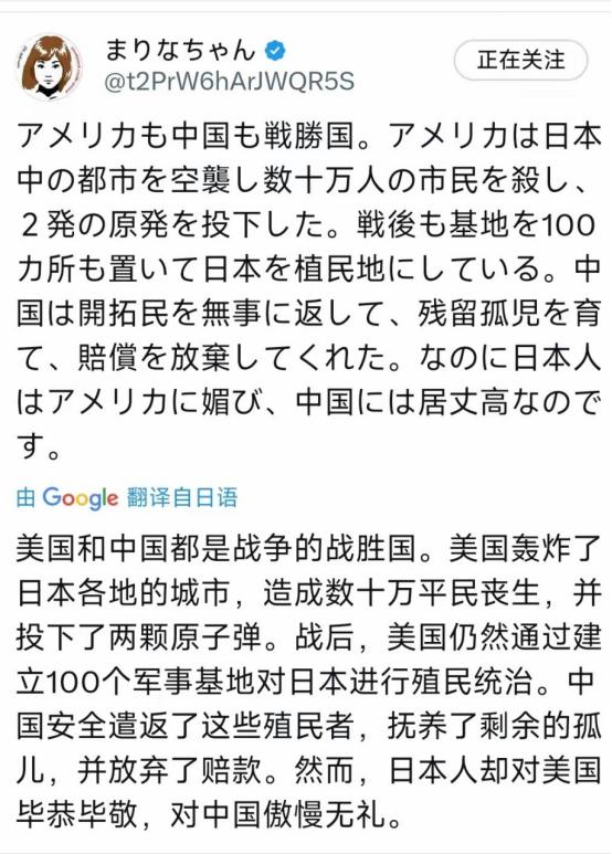 有位日本人终于说出了日本想说却不敢说的话!   中国和美国在二战结束后,对日本采取了完全不同的做法,而日本面对这两份截然不同的态度,做出的反应,也让人深思不已。   当年二战快结束的时候,日本可谓是腹背受敌,而美国对日本的打击,堪称毁灭性的。   1945年8月,两颗原子弹先后落在了日本的广岛和长崎,那一瞬间,两座城市化为焦土,无数平民在爆炸中失去生命。   光是广岛,当天就有近八万老百姓遇难,两座城市加起来,死伤人数更是超过了二十六万。   更可怕的是,核辐射的危害并没有随着爆炸结束而消失,而是持续影响了日本好几代人。   除了原子弹的重创,美国还对日本的多个城市发动了大规模轰炸,几十万平民在轰炸中丧生,无数房屋被夷为平地,整个日本陷入了一片废墟之中。   战争结束后,美国并没有就此撤离日本,反而通过《日美安全保障条约》,在日本长期驻扎军队,牢牢掌控着日本的安全与外交命脉。   这些驻日美军,名义上是“保护”日本,实际上更像是监视和控制日本的工具。这么多年来,驻日美军在当地干下的恶劣行径从来就没断过,强奸、杀人这类丧尽天良的恶性案件,时不时就会发生,当地老百姓被搅得鸡犬不宁,日子过得苦不堪言,有苦也没处说。   有数据显示,从2012年到2022年这十年间,涉及美军士兵的刑事案件就有三百多起,而就在去年,冲绳美军涉毒案件的数量,更是创下了二十年来的新高。   面对这些情况,日本政府往往显得无能为力,只能被动隐忍。   更让人不解的是,日本每年还要拿出将近一千九百亿日元,来承担美军基地的部分开销,他们还给这笔钱起了个看似温和的名字——“温馨预算”。   与美国的强硬管控不同,当年的中国,在自身极度困难的情况下,对日本展现出了最大的宽容和善意。   抗战胜利后,中国境内还滞留着两百多万日本侨民和战俘。那时候的中国,刚经历了长期的战争,经济破败不堪,老百姓连自己的温饱都成了大问题,很多人只能靠挖野菜、啃粗粮勉强糊口。   但即便如此,中国还是下定决心,要尽全力将这些日本人安全送回他们的国家。   从1946年5月到11月,在短短半年多的时间里,主要通过辽宁的葫芦岛港,中国成功将一百零五万多日本侨民和战俘安全遣返回国。   为了完成这件事,中国筹集了上亿斤粮食,专门供给这些日本人在途中食用;调动了一万三千多节火车车厢,还有大量的汽车、船只,负责他们的运输;沿途更是设立了临时医院,只要有侨民或战俘生病,就能及时得到医治。   更贴心的是,在安排遣返的时候,还特意照顾到日本家庭,尽量让一家人团聚,避免他们骨肉分离。   对于那些在战争中失去父母、被遗弃在中国的日本孤儿,很多善良的中国老百姓,放下了战争带来的仇恨,不计前嫌地收养了他们。   这些中国养父母,把这些日本孤儿当成自己的亲生孩子一样疼爱、抚养,供他们读书、教他们做人,辛辛苦苦把他们抚养成人,用温情化解了战争的伤痛。   后来,中国政府更是主动放弃了向日本索取战争赔款。这笔赔款其实中国完全有资格索要,但中国选择放弃,只为减轻日本战后的负担,推动两国关系走向正常化。   一边是曾经用原子弹轰炸自己、如今依然用军事力量控制自己的美国,一边是在自身困难时善待自己、主动放弃赔款的中国,日本对待这两个国家的态度,却有着天壤之别。   它对美国始终恭恭敬敬,甚至带着几分依附,不管美国提出什么要求,大多都会顺从;可对于曾经给予自己无限善意的中国,日本国内的一些势力,却常常有意无意地淡忘,甚至曲解历史,不愿意承认中国当年的恩情。   其实这背后的原因并不复杂:美国在日本有强大的军事存在,日本的安全和外交都高度依赖美国,这种依赖让日本没有反抗的底气,只能选择隐忍和迎合。   而对于中国当年的善意,日本国内的一些势力,却因为不愿正视自己的战争罪行,选择逃避历史,久而久之,就慢慢淡忘了这份恩情。   这些年来,日本国内的一些势力,一直不愿认真反省自己在战争中给亚洲各国人民带来的深重灾难,反而一味强调自己遭受原子弹轰炸的“受害者”身份,把自己放在委屈的位置上,却忽略了中国当年给予的巨大善意。   可历史事实不容篡改:美国在日本的军事存在,从来都是为了自身的战略利益,是为了维护自己在亚洲的霸权;而中国当年的宽容和善意,是主动的和平抉择,是希望世界远离战争、各国友好相处。   一个国家、一个民族,只有敢于正视自己的历史,分清什么是真正的威慑、什么是真诚的善意,才能赢得国际社会的长久尊重,才能更好地面向未来。