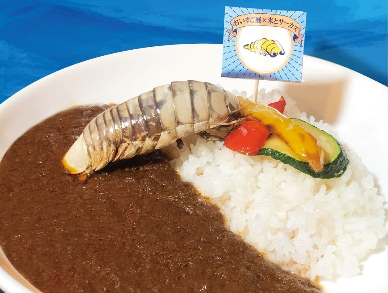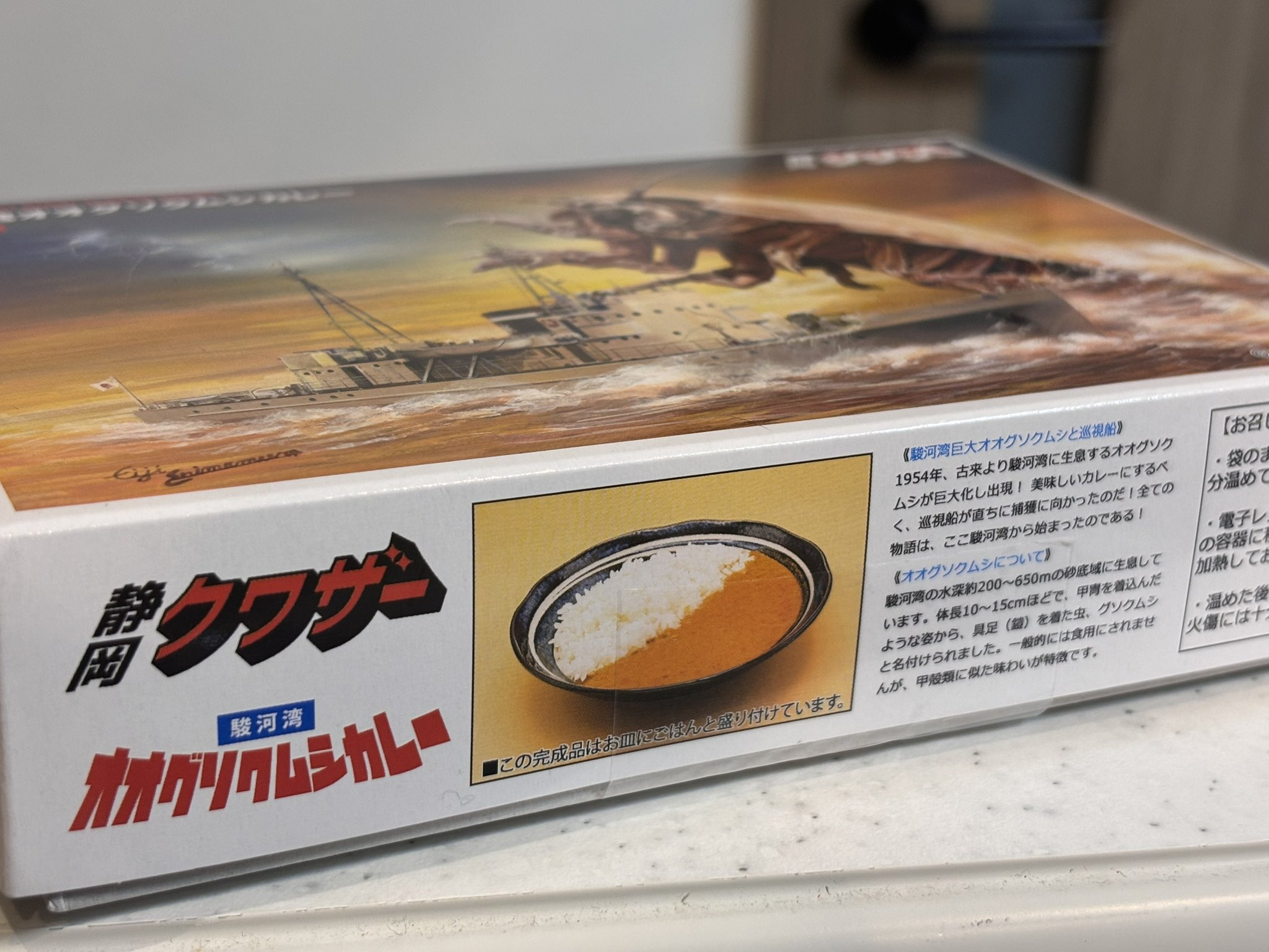 日本静冈县特产《骏河湾大王具足虫咖喱》,大王具足虫是一种生活在深海的等足目甲壳类,长得像放大版的“海底潮虫”,骏河湾是日本最有名的分布地之一,【图5】是当地水族馆和居酒屋联合推出的带油炸大王具足虫的咖喱饭,【图6】作为纪念品的版本里则只是「海鲜系咖喱」「带甲壳类风味」,并没有整只的大王具足虫。