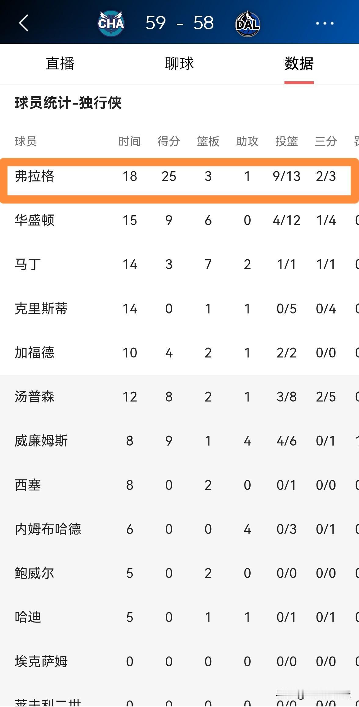 独行侠状元郎弗拉格真是彻底的杀红眼了!在今天独行侠主场迎战黄蜂的比赛中,目前双方半场战罢,虽然独行侠以58:59落后于对手,但是弗拉格在前两节比赛中大发神威爆砍25分。 在上半场比赛中,弗拉格首发出战18分钟,投篮13中9,其中三分球3中2、罚球5中5狂轰25分,还有3篮板1助攻,没有出现任何的失误和犯规,他的场上正负值为+6。 这就是弗拉格无与伦比的进攻天赋,他的得分手段可以说是非常的全面。