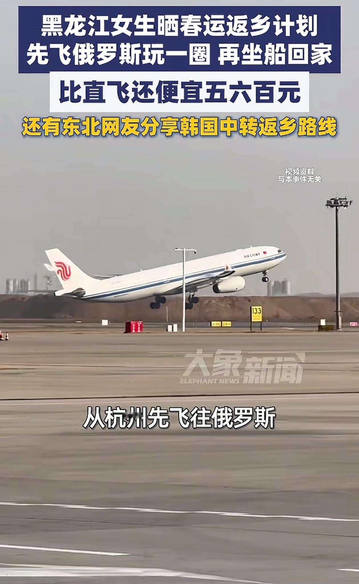 不服不行!浙江杭州一女子想回黑龙江老家,一看机票发现得好几千,为了省钱,她干脆买了张去俄罗斯的机票,然后直接坐船回到了老家,不仅省了钱还玩了一圈,简直一举两得。网友:“东北人回家真不容易”。 每年春运,对于在外打拼的游子来说,回家从来都不是一件容易事。 尤其是从南方返回东北的人,更是要在路费和路程之间反复纠结,要么花大价钱买机票,要么挤十几个小时的高铁,怎么选都觉得不划算。 在杭州工作的一位黑龙江姑娘,今年就遇到了这样的难题。 眼看着春节越来越近,她归心似箭,可打开购票软件一看,杭州直飞黑龙江老家的机票,一张就要好几千块。 这对于辛苦打拼一年的她来说,可不是一笔小数目,思来想去,她实在舍不得花这笔钱,可又不能不回家和家人团圆。 就在她对着高昂的机票犯愁,不知道该如何是好的时候,一个大胆的想法突然在她脑海里冒了出来。 她想起最近中俄实行互免签证政策,不用额外办手续就能去俄罗斯,于是抱着试试看的心态,搜了一下杭州飞往俄罗斯的机票,没想到价格竟然便宜得超出预期,比直飞老家的机票省了一大半。 这个发现让她眼前一亮,当即就下定决心,不走常规路线,先飞俄罗斯,再想办法回家。 她立刻下单买了杭州飞往俄罗斯符拉迪沃斯托克的机票,收拾好行李,就踏上了这段特别的返乡之路。 顺利抵达俄罗斯后,她没有急着赶路,而是借着这段中转的时间,在当地简单逛了逛,感受了一把异国风情,拍了些好看的照片,也算是给辛苦一年的自己放了个短假。 其实她之所以敢这么安排,还有一个重要原因,就是她的老家在黑龙江黑河,离俄罗斯边境只有几百米的距离,往来非常方便。 在俄罗斯游玩了几天,体验够了异域风光,她就动身前往边境,乘坐跨境气垫船过江,只用了几分钟时间,就顺利回到了自己的老家。 这一路算下来,她不仅省了五百多块钱,还额外收获了一段特别的旅行经历,说是一举两得一点也不为过。 后来,她把自己这段特别的返乡经历分享到网上,很快就引起了很多人的关注。 有人调侃她脑子转得快,用“邪修的脑子”想出了这么个省钱妙招;也有人忍不住夸赞她,说她把地理优势和政策红利摸得透透的,堪称春运省钱的天花板。 当然,也有不少人提出质疑,觉得去俄罗斯游玩的吃住也要花钱,算下来其实也没省多少。 其实,我觉得这位姑娘的做法特别聪明。 她没有被高昂的机票困住,而是换了个思路,既解决了回家的难题,又节省了开支,还收获了意外的快乐。 这种灵活变通的方式,确实值得借鉴。 这段时间,春运的热度一直居高不下,和这位姑娘有同样困扰的人不在少数。 很多人都在吐槽,热门航线的机票价格水涨船高,一张机票甚至相当于一个月的工资,可即便如此,还是一票难求。 坐高铁虽然便宜一点,但动辄十几个小时的路程,对于年纪大的人来说,身体根本扛不住,年轻人也觉得疲惫不堪。 也正因为这样,越来越多的人开始尝试不走常规路线。 有人从杭州先飞韩国济州岛,再转机回沈阳,比直飞便宜不少;还有国外的年轻人,为了节省路费,特意绕路转机回家,虽然多花了点时间,却实实在在省了一笔开支。 不过,也不是所有人都能复制这位姑娘的路线。 她之所以能顺利从俄罗斯坐船回家,关键是因为老家就在边境,有便利的跨境交通,再加上中俄互免签证的政策,才让这段特别的返乡之路成为可能。 对于大多数人来说,还是只能选择飞机、高铁这些常规的交通方式回家。 说到底,春运回家,图的就是一份平安和团圆。 不管是直飞回家,还是像这位姑娘一样辗转周转,不管是花得多还是花得少,只要能顺顺利利回到家人身边,就是最好的结果。 这位姑娘飞俄罗斯坐船回黑龙江,不仅省了钱还玩了一圈,这样的返乡方式,既解决了实际难题,又收获了意外惊喜,确实是一举两得。 希望每一个在外打拼的游子,都能找到适合自己的返乡方式,顺利回家,和家人一起度过一个温暖的春节,也希望未来的春运,能少一些奔波,多一些便利,让每一个归心似箭的人,都能轻松踏上回家的路。 今天的分享到这里就结束了,大家对此事有何看法,欢迎在评论区留言和讨论,感兴趣的可以点击头像加关注,我将每日更新优质内容,我们下期见。