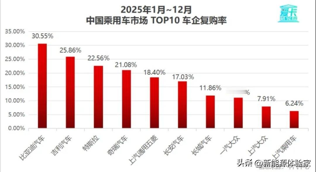 比亚迪复购率杀疯了!30.55%领跑全行业🔥 2025车企复购率榜单刚出炉,比亚迪直接断层第一!30.55%的老车主复购率,不仅甩开特斯拉近8个百分点,更是唯一突破30%的品牌,把行业14%的平均水平远远甩在身后~ 千万级用户基盘太能打!累计销量破1500万辆,每3位老车主增换购就有1位坚定选比亚迪,更狠的是跨品牌虹吸效应,每4个换新能源的消费者就有1个pick它,管你之前开合资还是自主,换电车默认首选比亚迪!