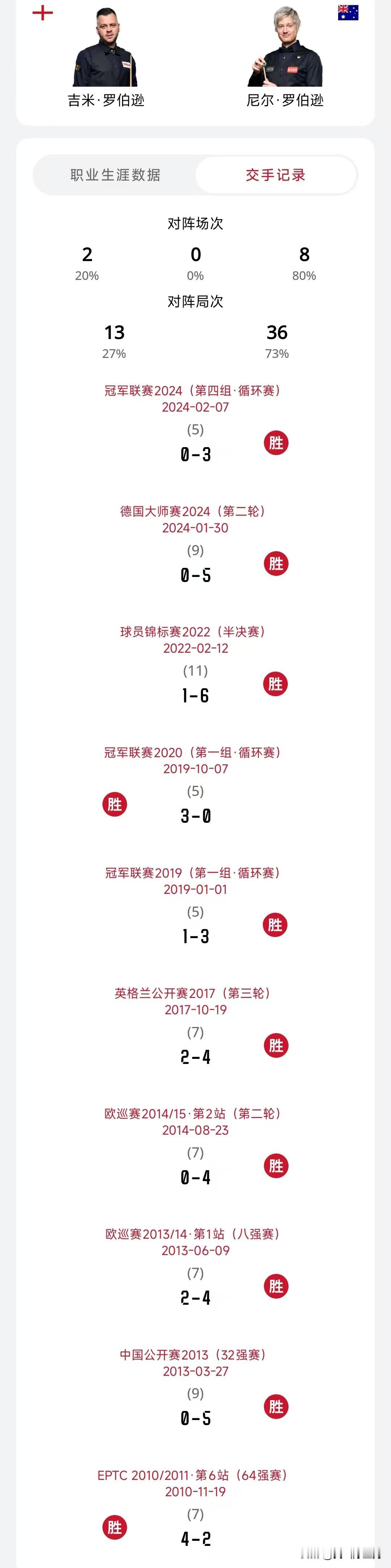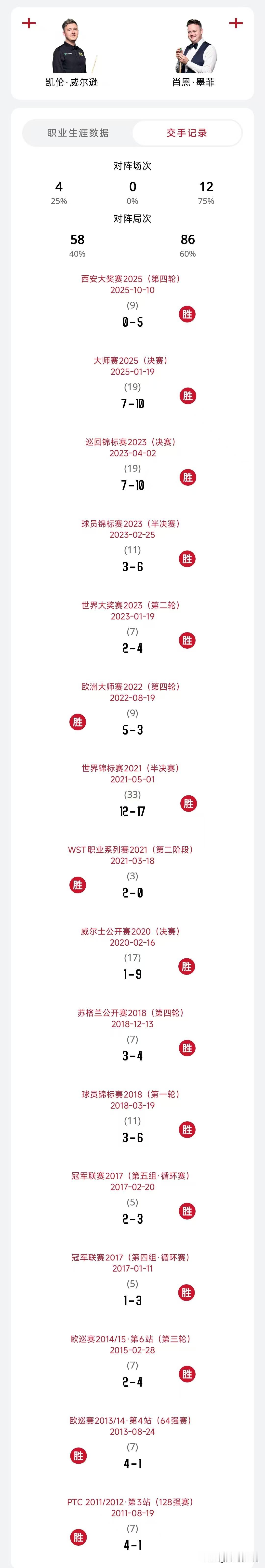 十连败肖国栋能否翻盘? 明日凌晨凌晨三点,肖国栋迎战世界第一特鲁姆普,历史成绩肖国栋2胜11负,赢得几盘还是很早之前的事情了,近10次交手未尝一胜,可以说处于绝对的劣势,这一次也不容乐观,小特本赛季一个冠军都没有,可以说饥渴感拉满。 另外几个对决,也是一边倒。 交手记录 墨菲12-4囧哥 机长21-13老猪 小特11-2果冻 萝卜8-2水萝卜 看看,这几位能否从苦主翻身。