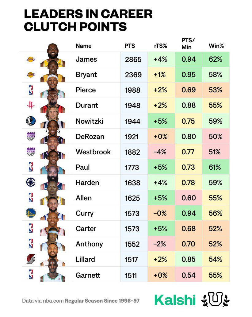 谁是关键时刻的GOAT?NbA从1996-97赛季至今,关键时刻总得分最多的球员是勒布朗-詹姆斯!达到2865分!打到关键时刻的比赛胜率62%,历史第一!!!