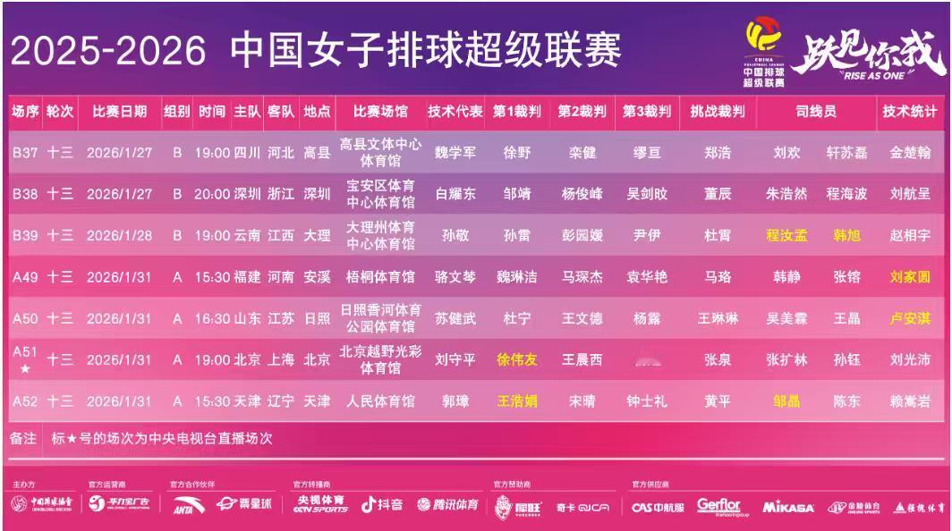 2025-2026赛季女排排超联赛第十三轮赛程来了,1月31号15:30,福建女排主场迎战河南女排,16:30山东女排主场迎战江苏女排,19:00北京女排主场迎战上海女排,15:30,天津女排主场迎战辽宁女排。第十二轮赛果:河南双汇 1:3 辽宁东港草莓;上海光明优倍 3:0 天津渤海银行; 江苏中天钢铁 3:1 北京北冰洋; 福建安溪铁观音 0:3 山东日照钢铁。目前积分排名:第1名上海光明优倍积分32分,第2名江苏中天钢铁积分28分;第3名山东日照钢铁积分25分 ;第4名北京北冰洋 积分:21分;第5名天津渤海银行积分:18分; 第6名辽宁东港草莓积分:8分;第7名 福建安溪铁观音积分:7分;第8名河南双汇积分:5分。第十三轮的比赛每一场都很精彩,福建女排和河南女排的比赛决定了谁积分第8名的问题,山东女排与江苏女排的比赛,让我们拭目以待,主要看杨涵玉的高拦网和杨佳这名新生代副攻之间的较量,论边攻水平,山东女排与江苏女排相比,还是略逊一筹。北京女排与上海女排的比赛,是双方外援之间的较量,北京队的外援法布里斯越打越好,上海队的沃龙科娃和范赖克是上海队的主要得分队员,感觉还是上海队配合更加流畅,本赛季上海队只在天津女排身上输过一场球,上海队还是实力最强的一支队伍。天津女排与辽宁女排的比赛虽然不影响排名,但是也是天津女排证明自己的时刻,上一轮与上海女排的比赛,天津女排0:3的失利,也反应了天津女排的小将需要提升的空间还是比较大。女排排超联赛第十三轮赛程 女排全国联赛 江苏女排联赛 中国女排超联赛 江苏女排天津女排 上海女排北京女排 山东女排