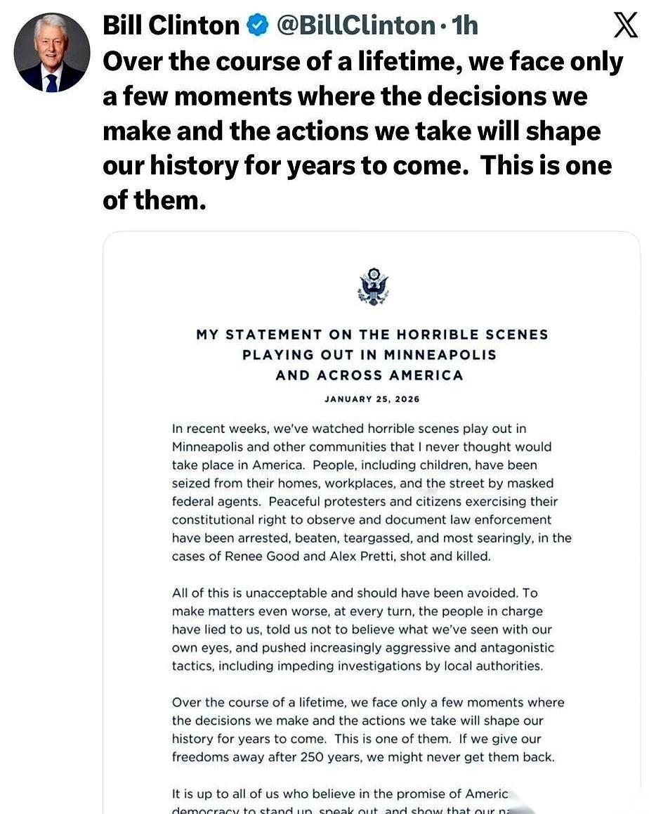 克林顿一篇声明,撕开了一个可怕的口子。 他说,蒙着面的联邦特工,正从街上、从办公室、甚至从家里,把人强行塞进车里带走,里面还有孩子。 这样的场景不是电影剧情,是2026年初发生在美国明尼阿波利斯市的真实乱象,主导这场暴行的正是美国移民与海关执法局的特工。 2026年1月13日,明尼阿波利斯市的街头就上演了一幕令人发指的闹剧。一名患有自闭症的残疾女性驾车前往医院就诊,途中被ICE特工拦下。双方短暂交涉后,蒙面特工直接砸碎车窗、割断安全带,将这名行动不便的女性强行拖出车外反绑带走。 现场民众试图上前劝阻,却被特工厉声呵斥,随后特工还发射催泪瓦斯驱散人群。这起事件发生的地点,距离另一名受害者蕾妮·古德遇难的地方仅两个街区。 有人想举起手机拍下这些暴行留存证据,特工们便会立刻将拍摄者一同抓捕,即便记者也无法幸免。1月14日,记者唐·莱蒙拍摄ICE特工粗暴盘查女性移民的画面时,遭到特工威胁,险些被投入监狱。这种做法彻底堵死了真相传播的渠道,让特工的暴力执法变得更加肆无忌惮。 和平抗议的民众,更是沦为了暴力镇压的目标。2026年1月18日,明尼阿波利斯市中心爆发大规模和平示威,起因是ICE特工突袭一处教堂并逮捕三名抗议者。前一秒,抗议者还在街头呼喊着捍卫权利的口号,坚守着宪法赋予的抗议自由。 下一秒,ICE特工就释放催泪瓦斯,挥舞棍棒冲向人群,抗议者们被呛得跪地不起,浑身是伤,现场一片混乱。据明尼阿波利斯警方报告,当天ICE特工使用的催泪瓦斯超过200罐,至少150名路人受到波及,其中不乏年幼的孩子。 暴力的升级从未停止,两声冰冷的枪响,彻底击碎了美国所谓的“人权神话”。蕾妮·古德和亚历克斯·普雷蒂,这两个普通的美国公民,永远倒在了联邦特工的枪口下。 38岁的蕾妮·古德是一位母亲,当时她正驾车接孩子放学,意外卷入执法乱局。ICE特工包围她的车辆并发射催泪瓦斯,她试图驾车逃离时发生侧翻,最终惨遭特工枪杀,遇难地点距离2020年弗洛伊德被跪颈致死的地方仅1.6公里。 紧接着,1月24日,37岁的亚历克斯·普雷蒂也惨遭毒手。这位前退伍军人、重症监护室护士,看到古德被攻击后上前保护。普雷蒂持有合法枪支携带许可证,却被特工迅速没收武器。 七名特工将他按倒在地,即便他反复高喊“我是公民”且未再反抗,仍被特工连开十枪击毙。尸检报告证实,十发子弹中有五发击中要害,射击距离不足两米,这根本不是执法,是赤裸裸的蓄意屠杀。 这些暴行绝非个例,数据早已揭露美国执法暴力的普遍性。美国伊利诺伊大学芝加哥分校的研究显示,美国每年约有25万人在执法过程中因不当执法受伤,另有600余人死于执法人员之手。美国“警察暴力地图”网站统计,2025年美国警察共造成1314人死亡,全年仅有6天没有出现警方致人死亡的案件。 仅ICE特工,去年夏天以来就在31起事件中使用枪支,造成11人伤亡,另有32人在羁押期间死亡,目前约7万人被关押在ICE拘留所,而2025年以来ICE特工的培训时长还缩短了30%。 更令人愤慨且脊背发凉的,不是这些血腥的暴行,而是当权者的冷漠与谎言。国土安全部在普雷蒂遇害后,公然谎称普雷蒂持枪“暴力反抗”,特工开枪是“出于自卫”。但现场流传的多段视频彻底拆穿了这个谎言,视频清晰显示普雷蒂被扑倒时手中只有手机,并未持有武器,多家美国主流媒体的调查结论也与政府说辞相悖。 特朗普政府不仅不为暴行道歉、不追究责任,反而试图让民众无视眼前的真相。他们扭过头,一脸平静地告诉所有人,大家看到的都不是真的,别信自己的眼睛,要信政府的说法。这种公然扭曲事实的行为,严重破坏了公众对政府的信任,连特朗普政府首任国土安全部首席法律顾问约翰·米特尼克都怒斥这些措施是“可耻、非法且残忍的”。 克林顿的声明,撕开的不仅是美国执法暴力的口子,更是美国制度性的腐朽与虚伪。当执法者沦为暴力的化身,当权者沦为谎言的传播者,公民的生命权、自由权便无从谈起。 这场席卷全美的抗议浪潮,覆盖15个州、超过10万人参与,正是民众对暴行的反抗、对真相的渴求。克林顿的警告绝非危言耸听,若放任这种乱象持续,美国所谓的“自由与民主”,终将在暴力与谎言中彻底崩塌。