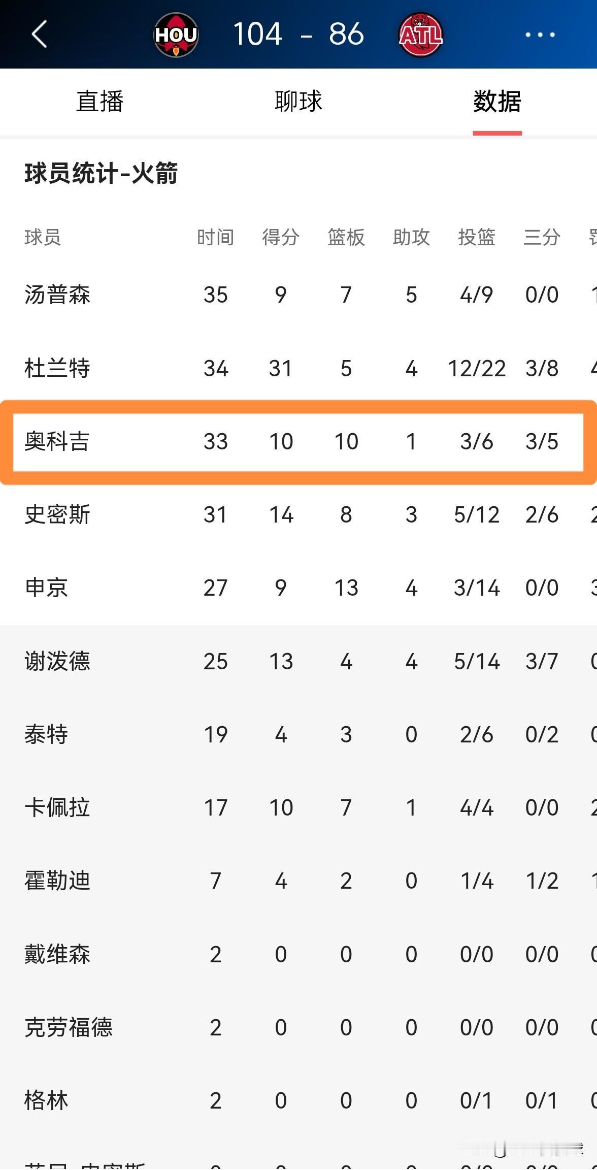 火箭悍将奥科吉的表现真是近乎完美!在今天火箭客场以104:86击败老鹰的比赛中,奥科吉打出了近乎完美的表现。 全场比赛下来,奥科吉首发出战33分钟,三分球5中3,其中罚球2中1得到10分10篮板1助攻1盖帽,他的场上正负值为+14。 最让人感到不可思议的是,本场比赛奥科吉拼抢到了全队最多的7个前场篮板,他凭借着一己之力为球队提供了多个二次进攻的机会。