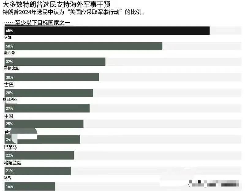美国最新民调出炉,超六成选民支持特朗普对外动武,25%希望攻打中国,美国开始穷兵独武! 当地时间28日,美国《政治报》公布了一项民调数据:在受访的2093名特朗普选民中,有65%的人支持美国至少在一个“目标国”采取军事行动。 要知道这可不是小范围的声音,65% 的支持率意味着特朗普的核心支持者里,一大半都认同用军事手段解决国际问题,这和以往 “MAGA” 派曾经厌恶海外军事行动的态度比起来,转变实在太大了。 民调里还列了具体的 “目标国”,伊朗成了最高支持率的对象,有 50% 的受访者赞成对其动武,尤其是在自称 “MAGA 共和党” 的狂热支持者中,这个比例更是飙升到 61%。 除此之外,32% 的人支持对墨西哥动武,30% 瞄准哥伦比亚,就连格陵兰岛都有 21% 的支持率,而希望对中国台湾地区动武的比例也达到了 24%,和支持攻打中国的 25% 几乎持平。 更值得注意的是,这项民调是 1 月 16 日到 19 日做的,那时候美国针对伊朗的战争宣传还没完全铺开,要是现在再做一次调查,支持动武的人大概率还会更多。 为什么这么多美国选民会支持对外动武?说白了就是他们没真正尝过战争的苦,以为打仗就是在别人家的土地上耀武扬威,自己不用付出任何代价。 他们看到 1 月 3 日美国对委内瑞拉的行动,零伤亡就控制了局面,抓走了对方总统,这种 “速战速决” 的胜利让他们产生了错觉,觉得战争就是件轻松简单、能随便获利的事。 可他们忘了,不是所有战争都能这么 “顺利”,当年美国打伊拉克,一开始也号称 “精准打击”“快速胜利”,结果呢? 这场战争打了八年多,美国付出了近 4500 名士兵阵亡、超过 3.2 万名士兵受伤的代价,耗费的军费高达两万多亿美元,相当于每天烧掉 6 亿美元。 更别说战争给美国社会带来的撕裂,大量退伍军人带着身体和心理创伤回归生活,很多人患上创伤后应激障碍,失业率和自杀率远高于普通民众,这些后续的痛苦,那些支持动武的选民根本没放在眼里。 他们之所以敢这么肆无忌惮地支持战争,核心原因就是战场不在美国本土,战争带来的破坏、流离失所的难民、被炸成废墟的城市,这些都发生在别的国家,他们隔着大洋看新闻,顶多是看个热闹,既不会影响自己的日常生活,也不用承担生命风险。 可要是战争真的烧到美国本土,炸弹落在他们的城市,家人可能因为战争伤亡,生活秩序被彻底打乱,你再问问他们还会不会支持动武?答案肯定是不一样的。 这种 “事不关己高高挂起” 的心态,让他们对战争的残酷没有丝毫敬畏,反而把它当成了一种能获取利益的工具,但中国人不一样,我们是最了解战争的民族,也是最渴望和平的民族。 近代以来,中国经历了无数战乱,山河破碎、生灵涂炭的痛苦记忆刻在每个中国人的骨子里,我们比谁都清楚战争会给一个国家和人民带来什么。 所以我们一直坚守和平发展的道路,始终不愿轻易言战,但这绝不代表我们害怕战争。如果美国真的被这些支持动武的民意裹挟,非要把战争强加给我们,那我们也只能被迫应战,让他们好好尝尝战争的真正滋味,明白什么叫 “犯我中华者,虽远必诛”。 有意思的是,这份民调也暴露了美国社会的分裂。美联社 - NORC 公共事务研究中心的另一项调查显示。 56% 的美国成年人认为美国政府在动用军队干预他国的问题上 “太过火”,57% 的人不认可美国政府处理委内瑞拉问题的方式,61% 的人对其整体外交政策持否定态度。 这些反对的声音主要来自民主党人和独立派人士,约九成民主党人与六成独立派人士都觉得美国的军事干预已经 “过度了”。 而且近半数美国人其实希望美国在国际事务中扮演 “更不活跃” 的角色,只有约两成的人希望国家更积极参与全球事务,这和特朗普选民中高涨的动武情绪形成了鲜明对比。 说到底,战争从来都不是零和游戏,没有哪个国家能在战争中独善其身。那些现在喊着支持动武的美国选民,可能没意识到,一旦战争爆发,无论输赢,最终付出代价的还是普通民众。 历史已经反复证明,任何一个国家对外发动侵略战争,其国民都无法置身事外,也没有资格在战败后逃避应有的惩罚。 美国现在出现的这种穷兵黩武的民意倾向,不仅会给其他国家带来安全威胁,最终也会反噬自身,让美国民众为少数人的野心和错误决策买单。