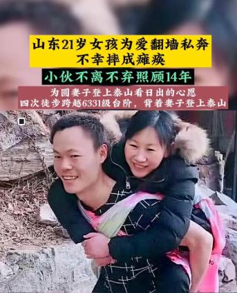2008年,山东21岁女子为爱翻墙私奔摔成瘫痪。男友知道后,不惜与父母断绝关系,也要娶她为妻。谁料到10年后,丈夫背起妻子,经历12小时,一步一步登上泰山之巅看日出。 2008年21岁的孔艳和张明荣在青岛一家工厂相识相恋,可这份青涩的爱恋,很快被现实泼了冷水,孔艳家人嫌张明荣家境贫寒,家里兄妹五个靠种地维生,初三就辍学打工的他,根本给不了孔艳安稳日子,还直接把上门的张明荣拒之门外。 被锁在房间里的孔艳急红了眼,她趁着家人不注意,爬上近三米高的院墙想去找张明荣,脚下一滑重重摔在地上,等张明荣接到电话从聊城老家赶去医院时,只看到浑身打满石膏的孔艳,医生的话像晴天霹雳:高位截瘫,余生大概率要与轮椅为伴。 所有人都以为张明荣会跑路,包括孔艳自己,可这个二十出头的小伙子,当着孔艳家人的面许下承诺:她是为我摔的,我必须管她一辈子,这话不仅遭到了自己家人的强烈反对,因为张明荣母亲本就半身瘫痪,家里根本容不下另一个病人,家人放话:敢走就不认你这个儿子,他还是毅然收拾行李,带着孔艳离开了老家。 那些年的日子,张明荣和孔艳的生活苦得就像泡在黄连水里,张明荣打三份工,白天卸货物、跑物流,晚上摆地摊卖衣服、烤串,累到沾床就睡,却从不敢耽误给孔艳翻身、按摩。 孔艳曾因家人照料不善患上碗口大的褥疮,医生都说情况不乐观,是张明荣寸步不离守在病床前,硬生生把她从鬼门关拉了回来。 日子再难也藏着细碎的温暖,张明荣从旧货市场淘来二手轮椅,每天背孔艳上下楼,省吃俭用买了电动轮椅,推着她去海边看浪,孔艳坚持康复训练,从只有头和手能动,到慢慢能用上肢发力,每一点进步都让两人看到希望。 2013年,他们的儿子出生,孩子成了这个小家最亮的光,让两个的生活也越来越好了。 2017年3月张明荣做了个决定,带孔艳去登泰山,这是两人刚恋爱时,孔艳随口提的心愿,他记了整整十年,出发那天天气还很冷,他特意准备了背架,把孔艳牢牢固定在背上,带着五个朋友一起上山,爬到一半四个朋友体力不支退了下去,只剩他和一个朋友,一步一步往上挪。 六千三百三十一级台阶,每一步都走得艰难,汗水浸透了衣衫喉咙干得冒火,双腿像灌了铅,可他从不说累只是偶尔停下来给孔艳擦汗、喂水,十二个小时后登顶时,张明荣忍不住哭了,而孔艳看着身边的丈夫,笑得像个孩子。 没人想到这一登就是四年,2017到2021年,张明荣每年都背着孔艳爬泰山,哪怕2021年途中摔了一跤没能登顶,也从没想过放弃,日子渐渐有了起色,他开起了卤菜店,网上订单源源不断,和家人的关系也慢慢缓和,还补拍了婚纱照给了孔艳一场迟到的婚礼。 如今的孔艳已经能用助行器走一段路,坐在轮椅上还能帮着做家务、打理卤菜生意,医生都说这是康复奇迹,有人问张明荣后悔吗,他只是笑着说:爱情不是浪漫誓言,是柴米油盐里的相互体谅,是遇事时的一起扛。 从2009年的高墙坠落,到2017年的泰山日出,从一无所有的穷小子,到撑起一家四口的顶梁柱,张明荣用十三年光阴证明,真正的爱从不是锦上添花,而是在风雨中为你撑腰,把你的遗憾都变成圆满。 那些爬过的台阶,吃过的苦最终都化作了岁月里最珍贵的礼物,照亮了他们往后的每一段路。 麻烦看官老爷们右上角点击一下“关注”,既方便您进行讨论和分享,又能给您带来不一样的参与感,感谢您的支持! 信息来源:新华网——小伙连续四年背瘫痪媳妇爬泰山 只为圆媳妇的梦想