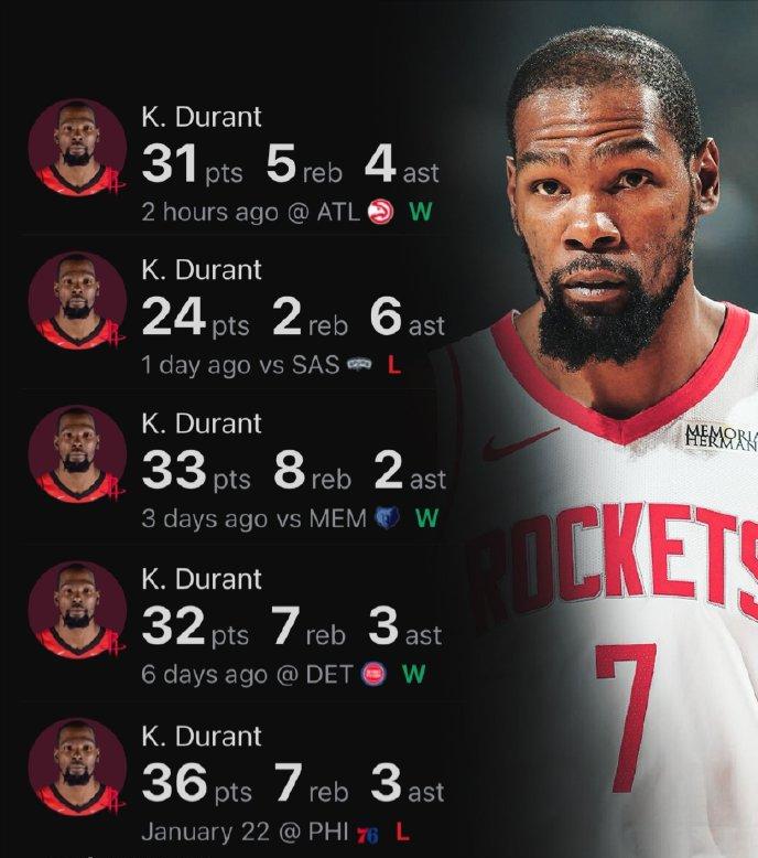 抡冒烟了!过去5场的杜兰特: 对阵76人:36分7篮板3助攻 对阵活塞:32分7篮板3助攻 对阵灰熊:33分8篮板2助攻 对阵马刺:24分2篮板6助攻 对阵老鹰:31分5篮板4助攻 这5场比赛的出场时间分别是:44分钟、41分钟、37分钟、36分钟、35分钟。 更离谱的是,这5场比赛,对阵76人和活塞是客场背靠背,对阵马刺和老鹰是客场转主场的背靠背。 两个背靠背,一次场均42.5分钟,一次场均35.5分钟,这对于目前37的杜兰特而言是巨大的消耗,而难受的是,乌度卡现在不敢下杜兰特,一下就输球。 现在的杜兰特,全力输出,而火箭队,也进入了“熬老头”时刻。