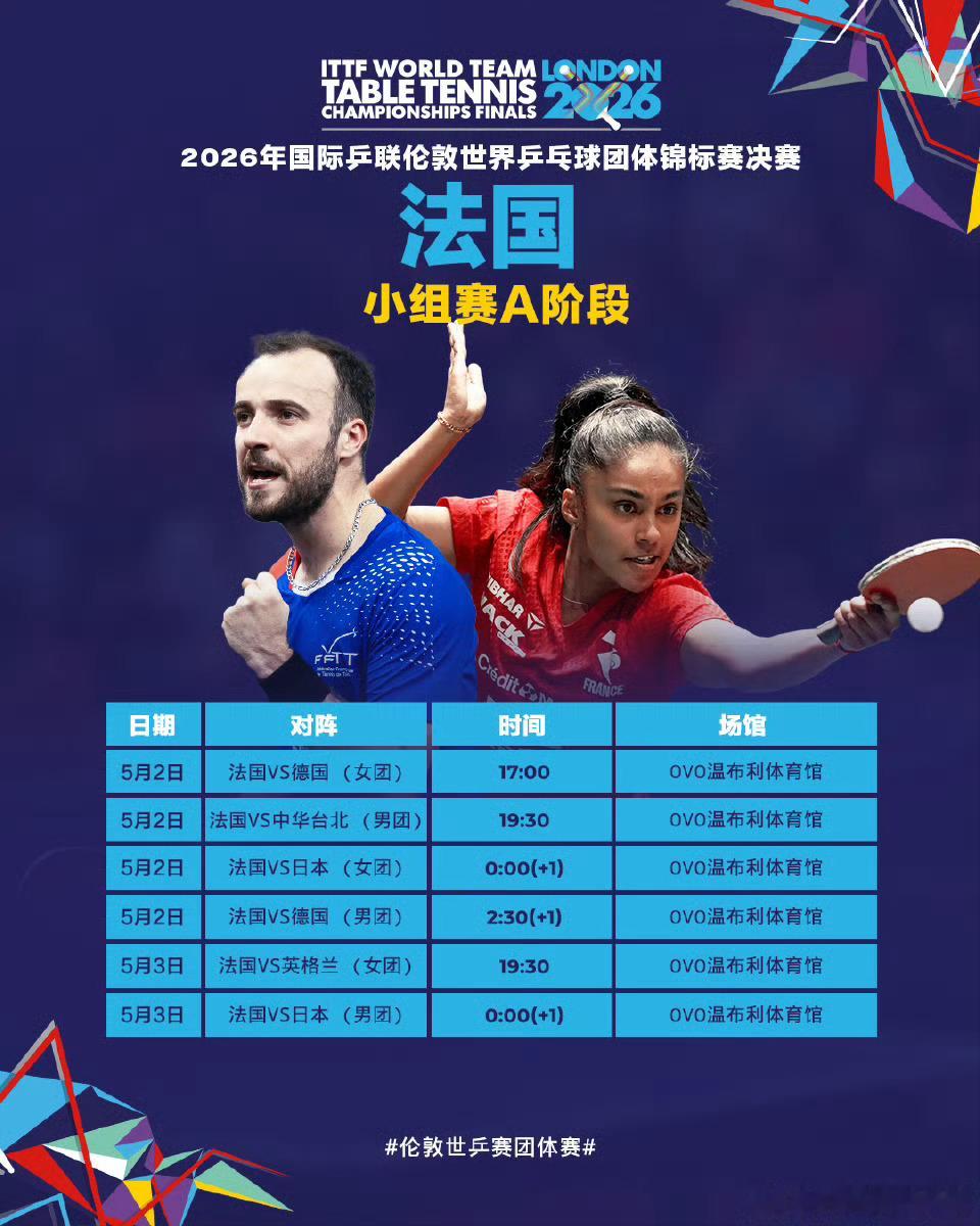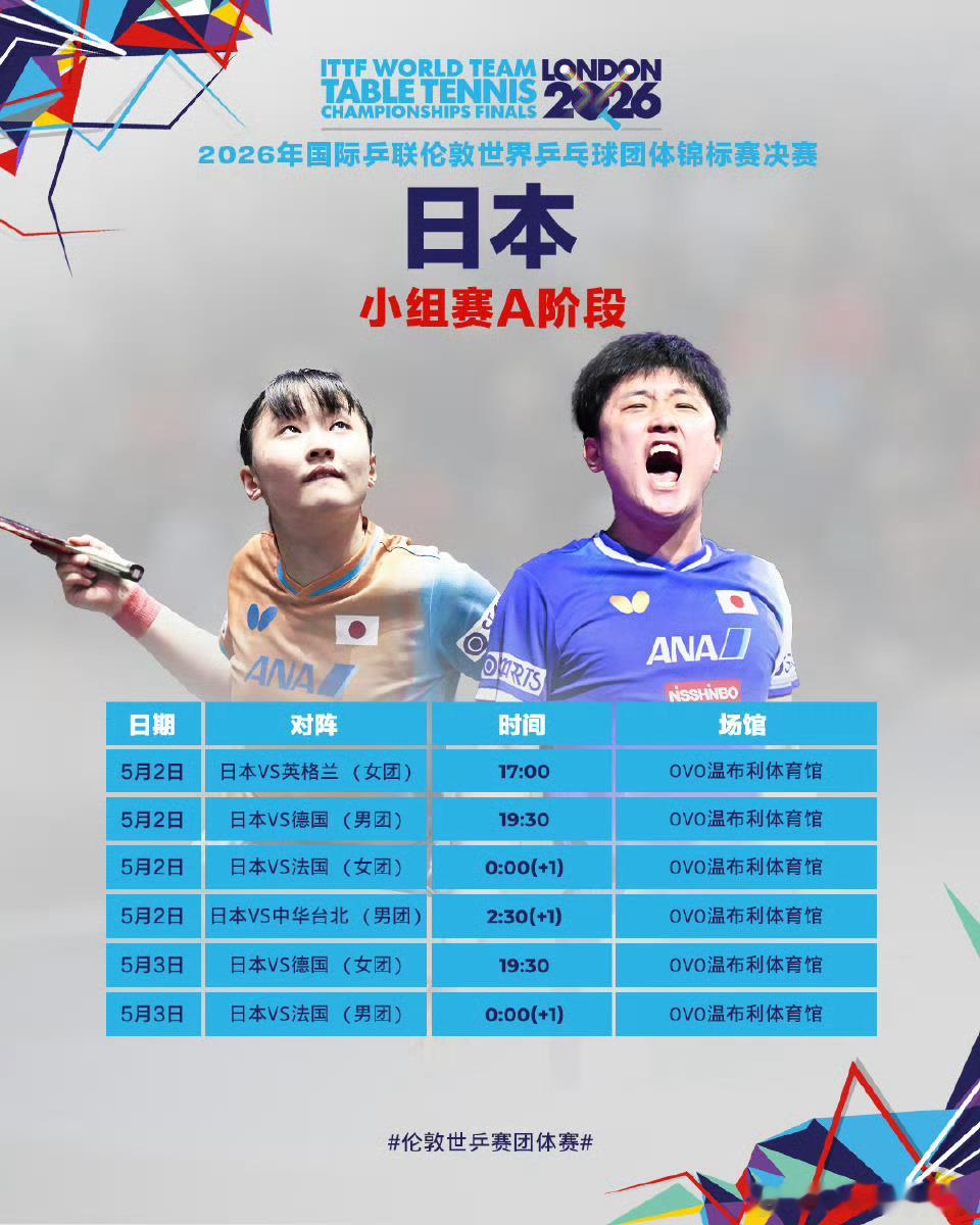 5月2日17:00 女团小组赛:中国 vs 罗马尼亚(1号台)19:30 男团小组赛:中国 vs 英格兰(1号台)次日00:00 女团小组赛:中国 vs 中国台北(4号台)次日02:30 男团小组赛:中国 vs 韩国(4号台)5月3日19:30 男团小组赛:中国 vs 瑞典(1号台)19:30 女团小组赛:中国 vs 韩国(4号台)赛程特点:首日(5月2日)从17:00至次日02:30,55小时内需完成6场比赛,其中9.5小时连打4场,含两场凌晨关键战。5月3日男女团同步出战,男团迎战传统强队瑞典,女团直面世界第三韩国队。