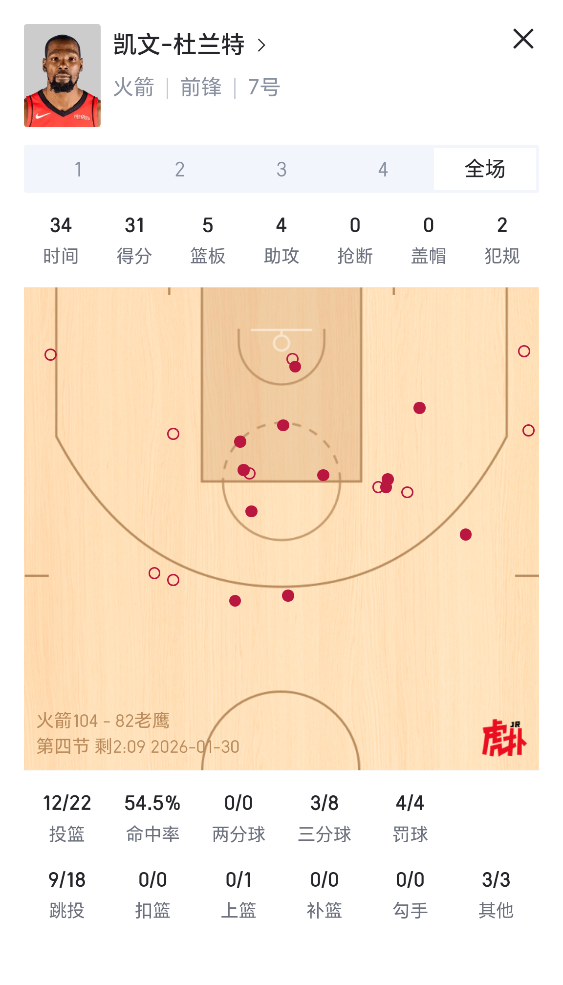 杜兰特31分5篮板,火箭大胜老鹰!