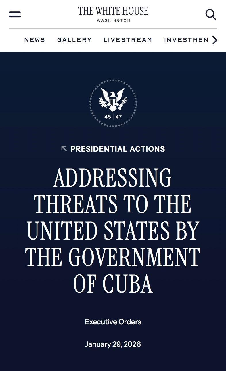 行政令于美东时间2026年1月30日凌晨生效。此举延续特朗普政府对古巴的强硬立场,包括其第一任期内逆转部分宽松政策,以及2025年6月针对古巴恐怖主义赞助、执法合作缺失等问题实施的旅行限制和国家安全备忘录。
