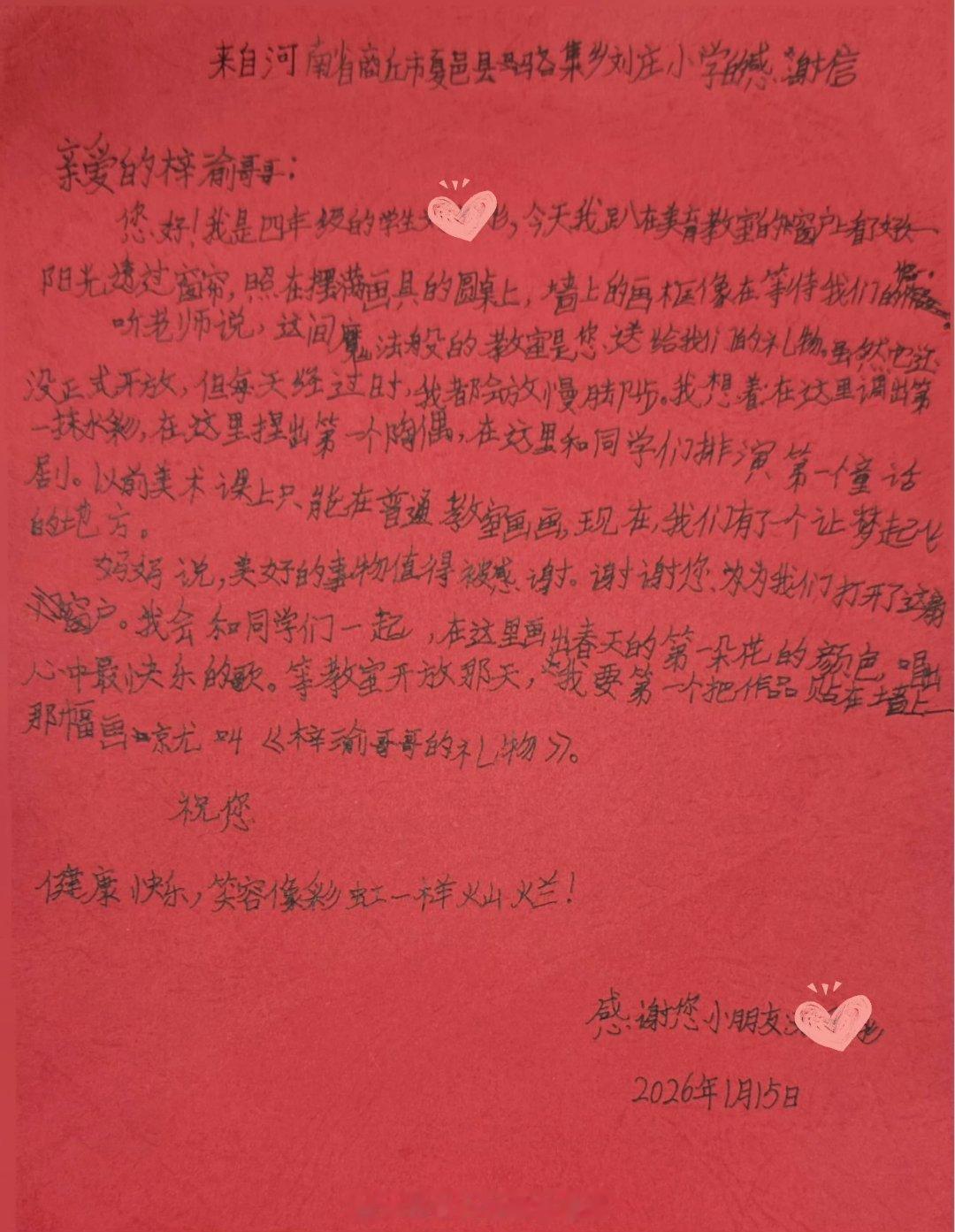 刘庄小学给梓渝的感谢信在大家不知道的时间里,公益行动也在默默推进,从被标上“流量”的标签之后他一直在身体力行的把流量化为实质行动,帮助更多人,好棒!
