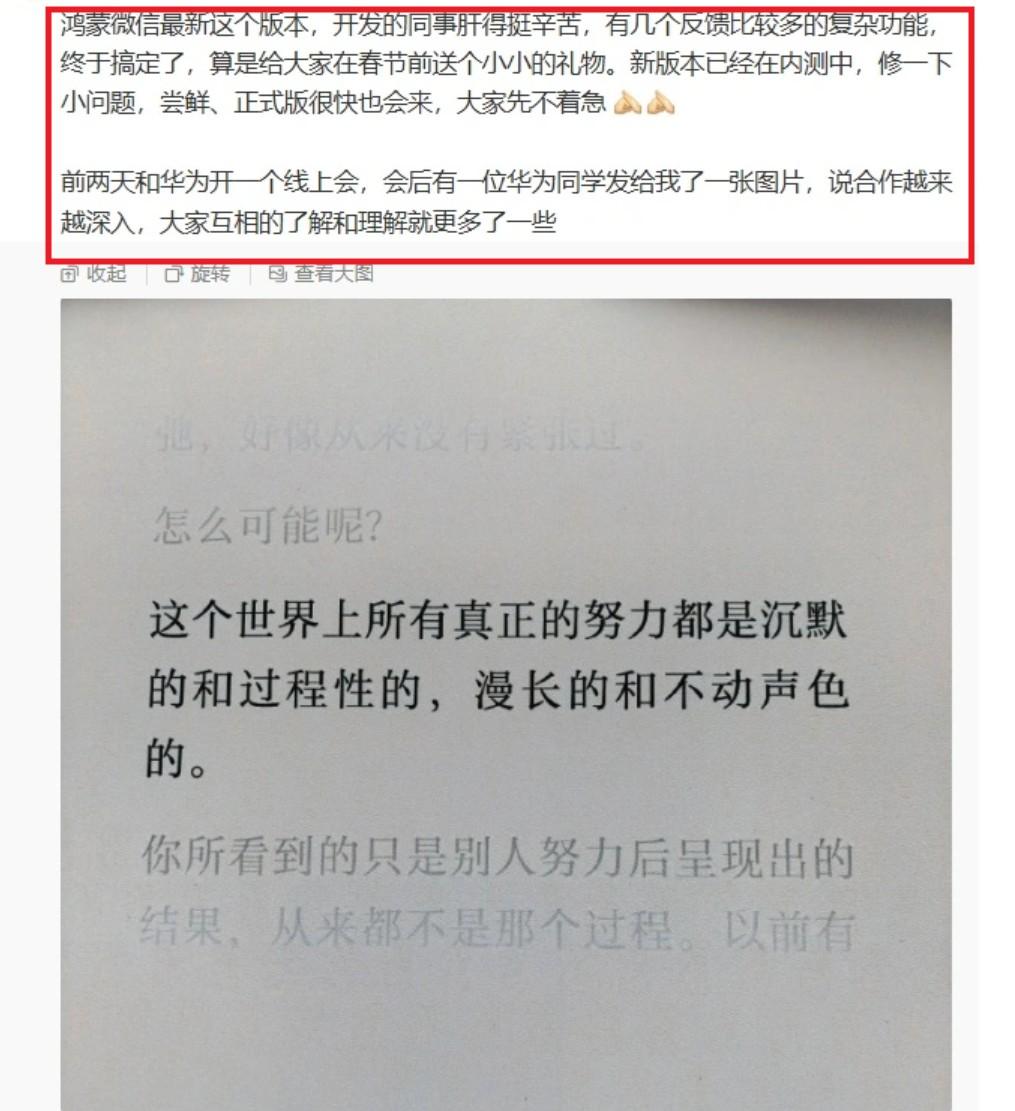 微信华为鸿蒙版,真的在悄悄补齐最后一块拼图,在路上了! 看到微信员工 @客村小蒋 发文“剧透”:鸿蒙版微信的新版本已经在内测了,一些反馈最多、实现难度也最大的功能,春节前终于搞定,算是给用户的一个小礼物。尝鲜版、正式版,都已经在路上。 从昨晚开启的 8.0.15.32 邀测来看,这次升级并不是简单修 bug,而是一口气补齐高频刚需: 收藏终于能新建、编辑笔记,聊天界面还能直接一键发送收藏内容;表情玩法明显升级,互动表情、表情雨、红包配表情、最近使用表情全都安排上;朋友权限里新增“添加我的方式”,隐私和可控感也补回来了。 更关键的是生态打通。 支持扫码登录手表蓝牙微信、微信礼物和抽奖、公众号主页展示橱窗,再加上状态功能逐步开放,鸿蒙版微信已经不只是“能用”,而是在向完整体验靠拢。 别忘了一个背景: 微信鸿蒙版上线一年,安装量已经超过 3890 万,微信支付也正式接入鸿蒙 5 收银台。现在这轮功能补齐,基本意味着—— 鸿蒙生态里最关键的那块应用拼图,终于进入成熟期了。 一句话总结: 这不是一次普通更新,而是鸿蒙版微信从“追进度”,走向“追体验”的重要节点。春节前这一更,含金量不低。