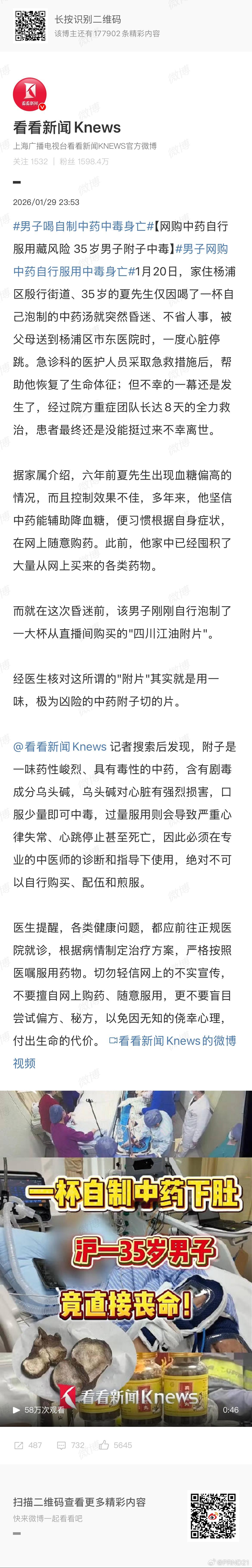 男子喝自制中药中毒身亡 【据家属介绍,六年前夏先生出现血糖偏高的情况,而且控制效果不佳,多年来,他坚信中药能辅助降血糖,便习惯根据自身症状,在网上随意购药。此前,他家中已经囤积了大量从网上买来的各类药物。而就在这次昏迷前,该男子刚刚自行泡制了一大杯从直播间购买的"四川江油附片"。】