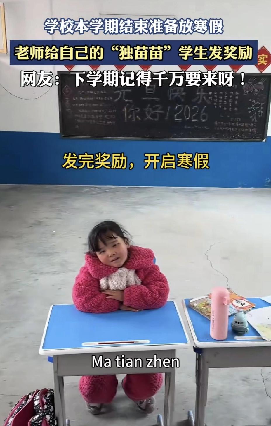农村教育这是个避不开的话题!很多农村都是一师一生撑起一所学校,这不,期未放寒假了,一位教师给独苗学生发放奖状,寒假作业,这事感动全网,有人心酸农村教育的落寞,也有人喊叹国家对每一个孩子的不放弃。 随着城镇化进程加快,农村生源流失严重已是不争的事实,从最初初的村村有学堂到现在只剩一名学生与一名坚守的教师! 就有网友感叹:泱泱大国,学校都走到了这个地步,到底是哪里出了问题?看着不由得心酸! 也有网友说:心酸什么?就不能看到好的一面?即使只有一个孩子,学校不撤,老师不走,这是政策的托举,这不是浪费资源,而是中国教育最朴素的初心,国家不放弃每一个孩子的基础教育。试问,哪个国家能像我们这样重视下一代教育!教育改变了一代又一代人的命运。这不该骄傲吗?这不农村教育的落寞,而是中国教育公平的最后一公里!我们应该向政府致敬,向学校致敬,向老师致敬。 更有网友引用数据分析原因,比如2016年1700万出生人口,2026年700万出生人口,直接少了快1000万,生存压力导致出生率降低,是生源越来越少的原因,这也是经济发展的必然结果! 你怎么看待农村教育这件事呢?