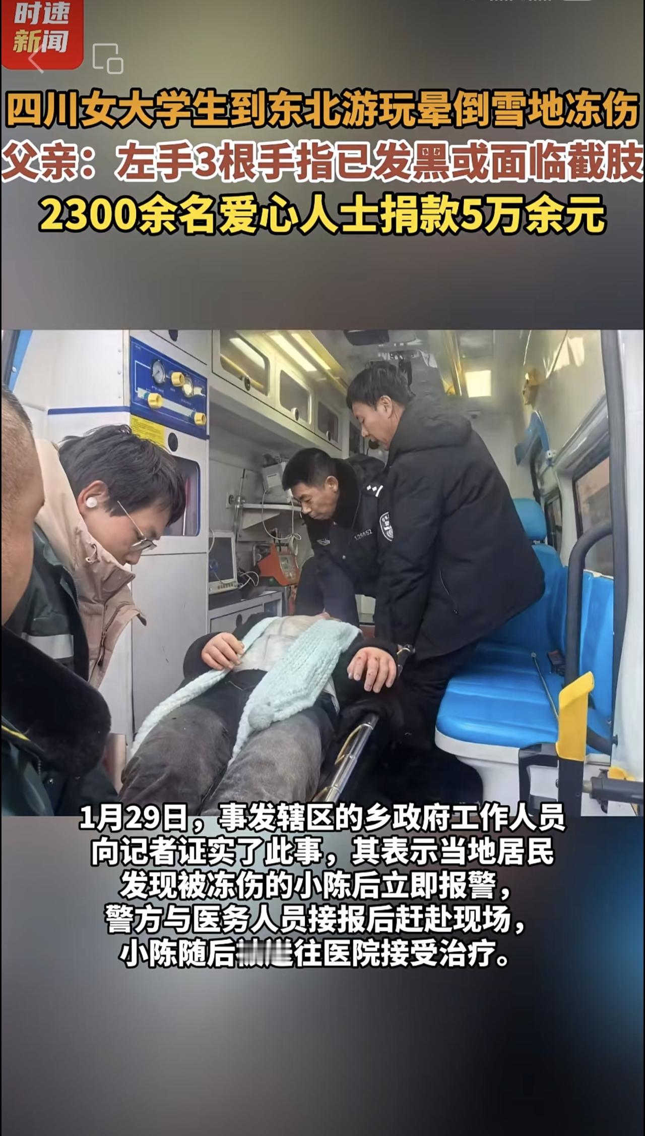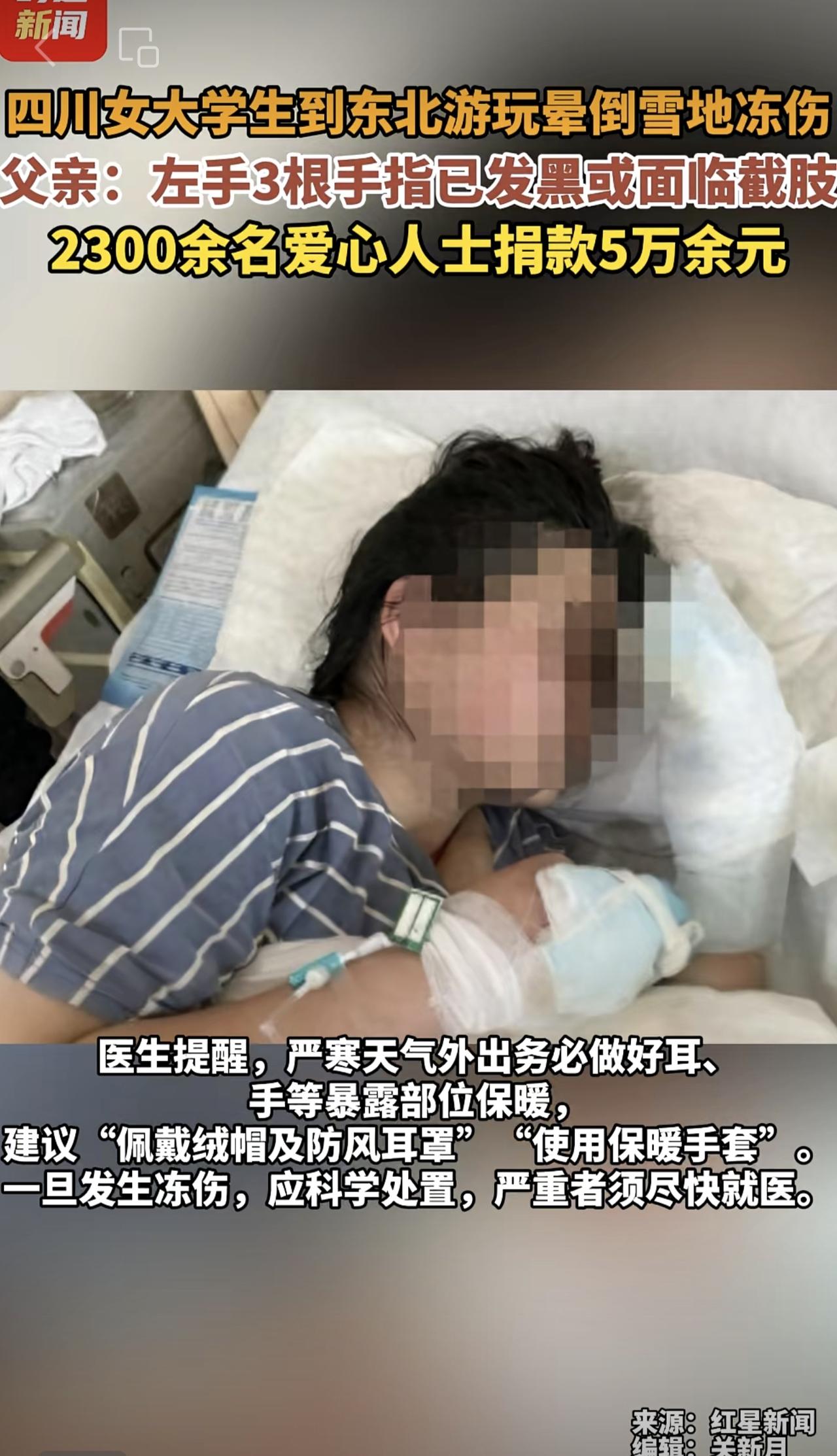 四川女大学生到东北游玩晕倒雪地冻伤,父亲:左手3根手指已发黑或面临截肢,2300余名爱心人士捐款5万余元