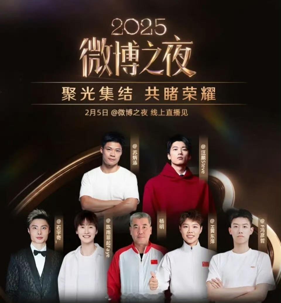 2025年微博之夜开屏阵容官宣✨ 中国体坛冠军天团登场:杨明(国羽混双主教练)、苏炳添、汪顺、石宇奇、陈雨菲、黄东萍、冯彦哲等体育明星齐聚,共赴星光时刻🇨🇳🏆 微博之夜羽毛球