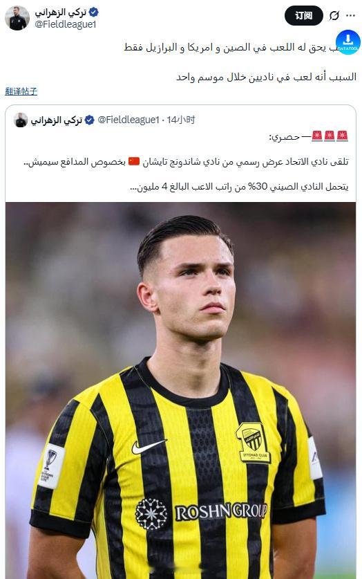 据海外记者图尔基-扎赫拉尼消息,吉达联合俱乐部收到了山东泰山关于后卫西米奇的正式报价。中国俱乐部将承担该球员400万年薪的30%。该租借报价被招聘委员会拒绝了。俱乐部希望这名球员离开,以便签下一名本土前锋。