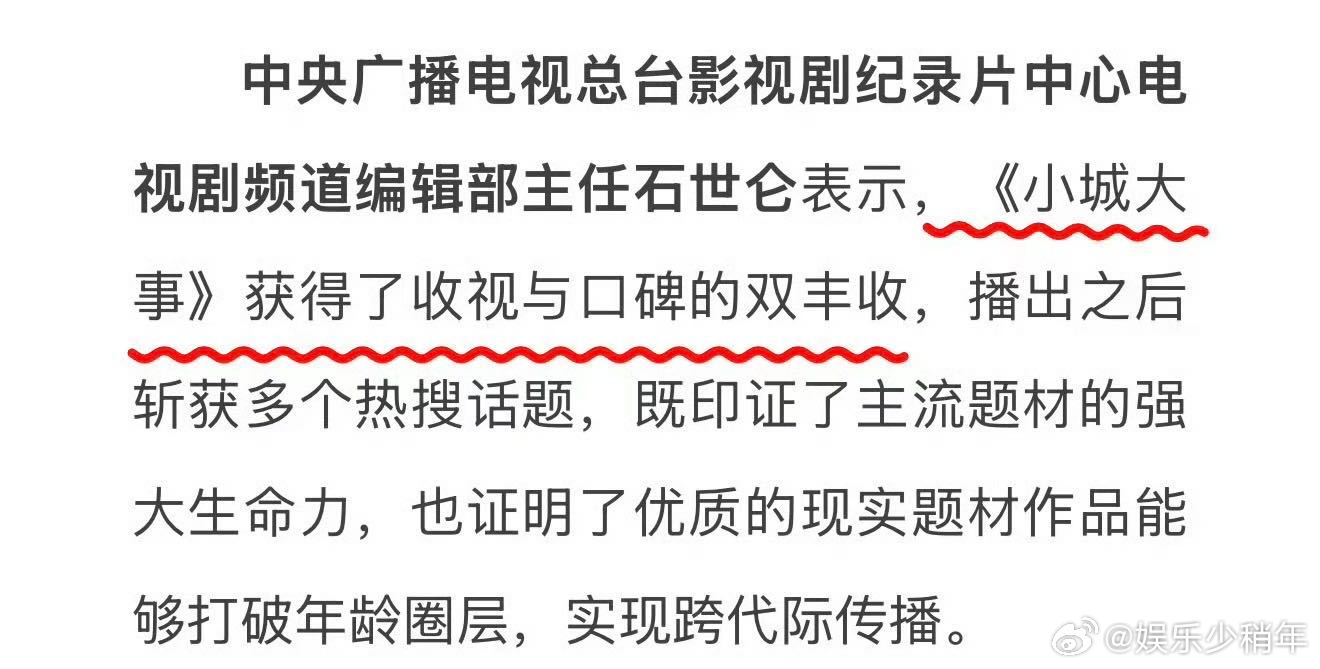 小城大事收视口碑双丰收小城大事 细腻群像刻画普通人的奋斗日常,展现美好生活的创造之路,值得反复二刷细细品味。