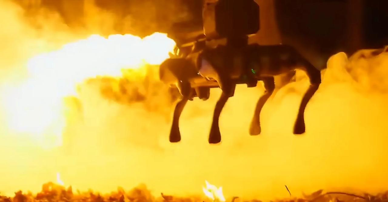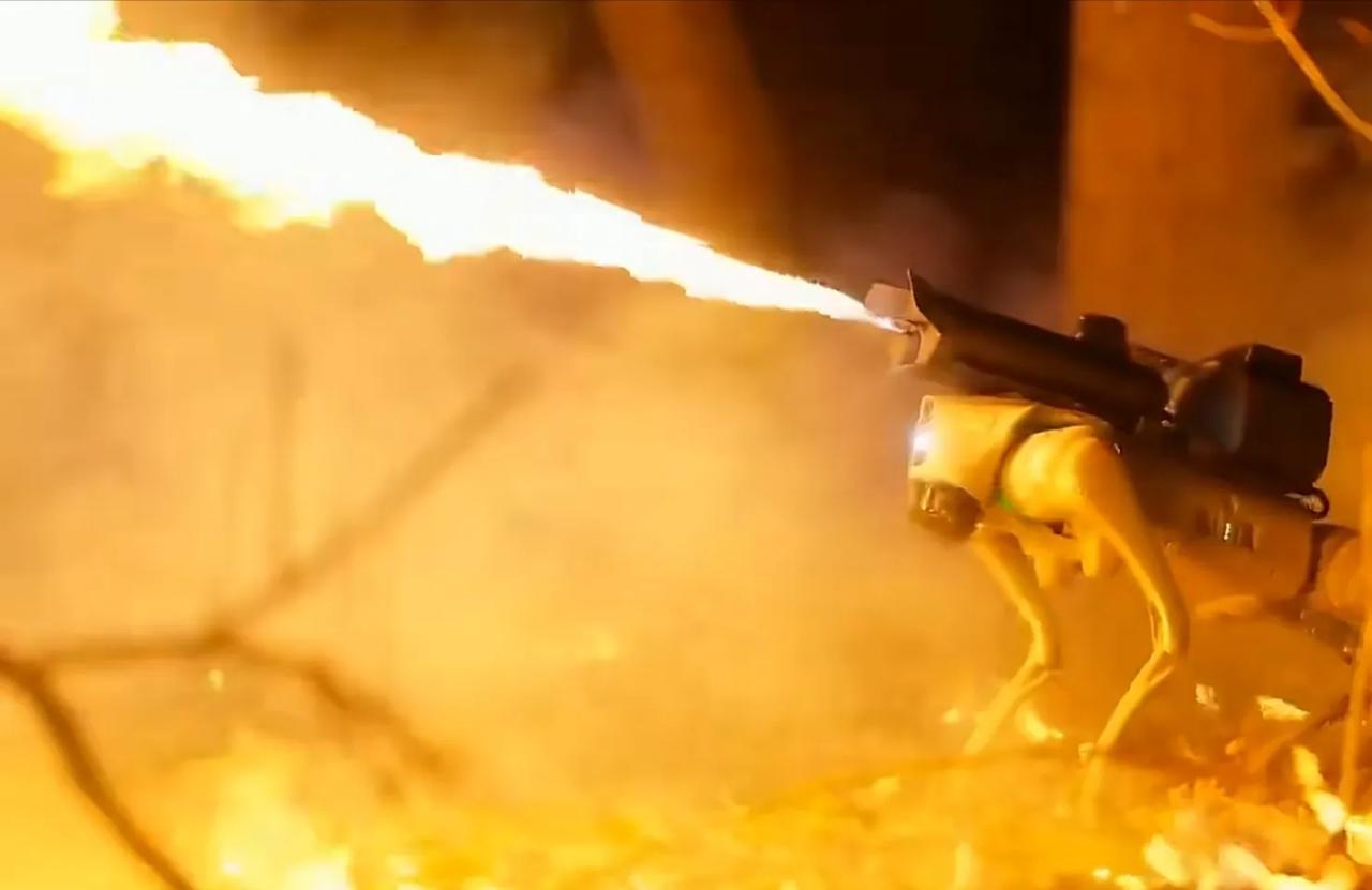 机器狗背上火焰喷射器,喷出烈焰,视觉冲击力拉满。 无人装备在战场上越来越多,天上