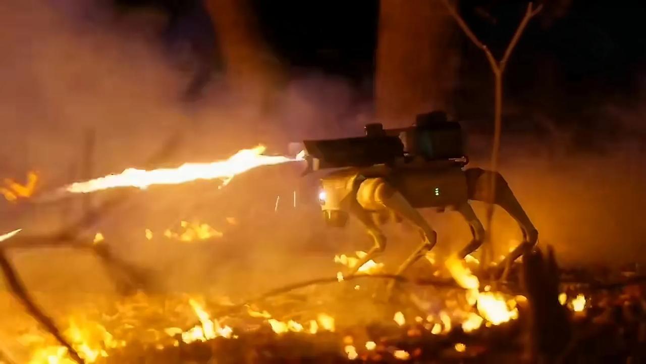 机器狗背上火焰喷射器,喷出烈焰,视觉冲击力拉满。 无人装备在战场上越来越多,天上、地上、水面、水下无所不有,而且不断的技术迭代,再加上俄乌冲突这样大规模、高强度战争的实战检验,使无人装备的性能蹭蹭蹭往上涨。未来战争,将是科技先进国家吊打科技落后国家。