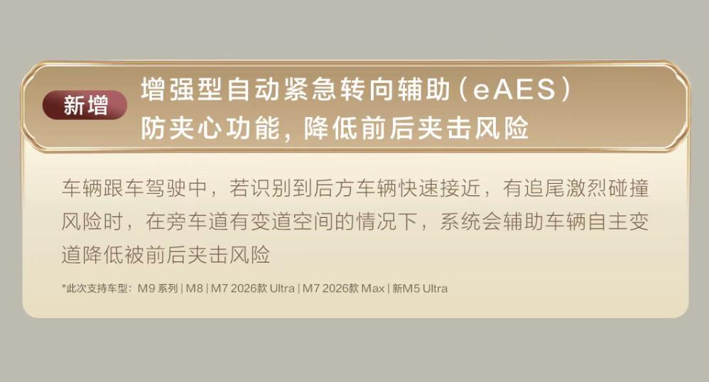 今早问界发布全系车型辅助驾驶相关的新年OTA升级公告,部分车主已经下载安装。细看了下,有三个核心新增功能。 1、三点式掉头,NCA状态掉头空间不够,车辆可以自行倒车腾挪空间。 2、增强型自动紧急转向辅助(eAES),跟车驾驶过程中,检测到后方车辆有碰撞风险、旁车道有空间情况下,可自行变道规避碰撞。 3、驾驶员失能辅助,驾驶员疲劳或突发疾病丧失驾驶能力时,车辆会自主靠边停车,打开双闪,同时呼叫救援。【来自懂车帝车友圈】