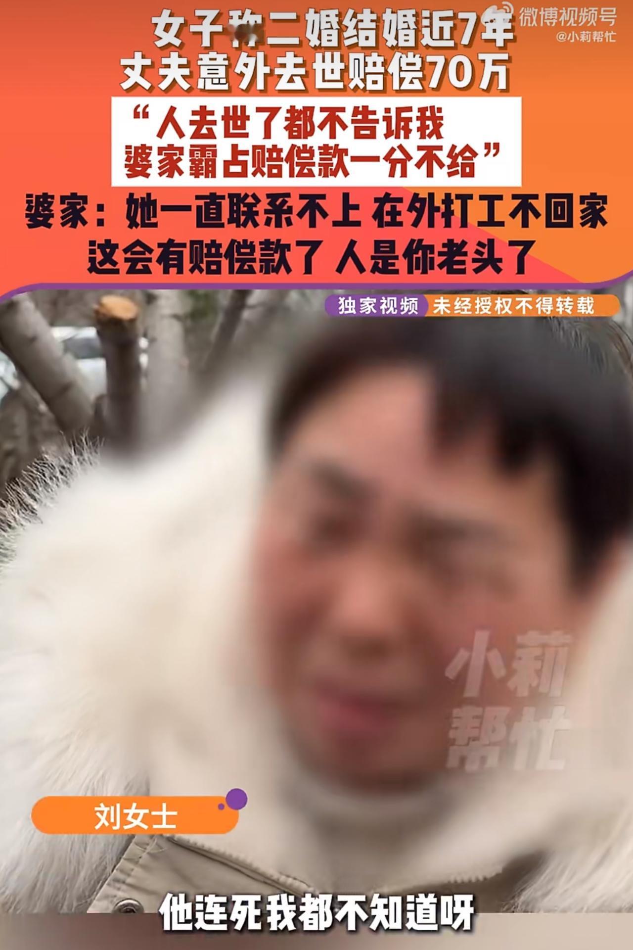 河南洛阳出了件让人议论纷纷的事儿,刘女士和丈夫是二婚,两人领证后,刘女士去了新疆工作,丈夫留在郑州,本以为各自努力,日子能越过越好,可没想到,意外突然降临,刘女士的丈夫在工地干活时,突发心梗,经抢救无效去世了,可奇怪的是,丈夫去世这么大的事儿,刘女士居然完全不知情,她联系不上丈夫,四处打听,这才得知丈夫已经走了,更让她气愤的是,丈夫去世后,70万的赔偿款被公婆和小姑子领走了,一分都没给她,刘女士觉得这钱自己理应有一份,毕竟自己是丈夫的合法妻子,于是便找婆家理论,希望能讨个说法。 但婆家那边态度很强硬,对刘女士很不满,他们说,刘女士和丈夫结婚后,几乎没怎么回过家,过年都不回来团圆。儿子在世的时候给她打电话,她都给拉黑了。在他们眼里,刘女士就是个不顾家的人,现在丈夫走了,赔偿款下来了,她才回来要钱,根本没资格拿这笔钱,婆家还表示,如果刘女士要走法律程序,法院判多少他们就给多少。 从法律层面来看,刘女士作为丈夫的合法配偶,属于第一顺位法定继承人,按照规定,在丈夫没有留下合法有效遗嘱的情况下,她依法享有丈夫的赔偿款等遗产,不过,如果婆家有证据证明刘女士有抚养能力却常年不回家,没有尽到夫妻间的扶助义务,法院在判决时,可能会依据实际情况,酌情判定她少分相应的财产份额,这起事件里,双方都有各自的委屈和想法,刘女士可能觉得自己在外工作也是为了这个家,虽然没常回家,但心里还是有丈夫的,而婆家觉得儿子辛苦一辈子,儿媳却不闻不问,现在来争赔偿款,实在难以接受。 其实,类似这样因为亲人去世引发财产纠纷的事儿并不少见,有的家庭因为遗产分配问题,兄弟姐妹反目成仇;有的夫妻一方去世后,另一方和对方家人为了财产闹上法庭,这些纠纷背后,往往不只是钱的问题,更多的是情感上的伤害和矛盾,在这件事里,刘女士和婆家与其一直僵持不下,不如坐下来好好沟通。毕竟曾经是一家人,丈夫的去世对大家来说都是巨大的打击,如果实在协商不成,也可以通过法律途径解决,让法院根据实际情况做出公正的判决。希望双方都能冷静下来,妥善处理这件事,别让矛盾越积越深。 丈夫去世妻子不知情 事件来源:小莉帮忙