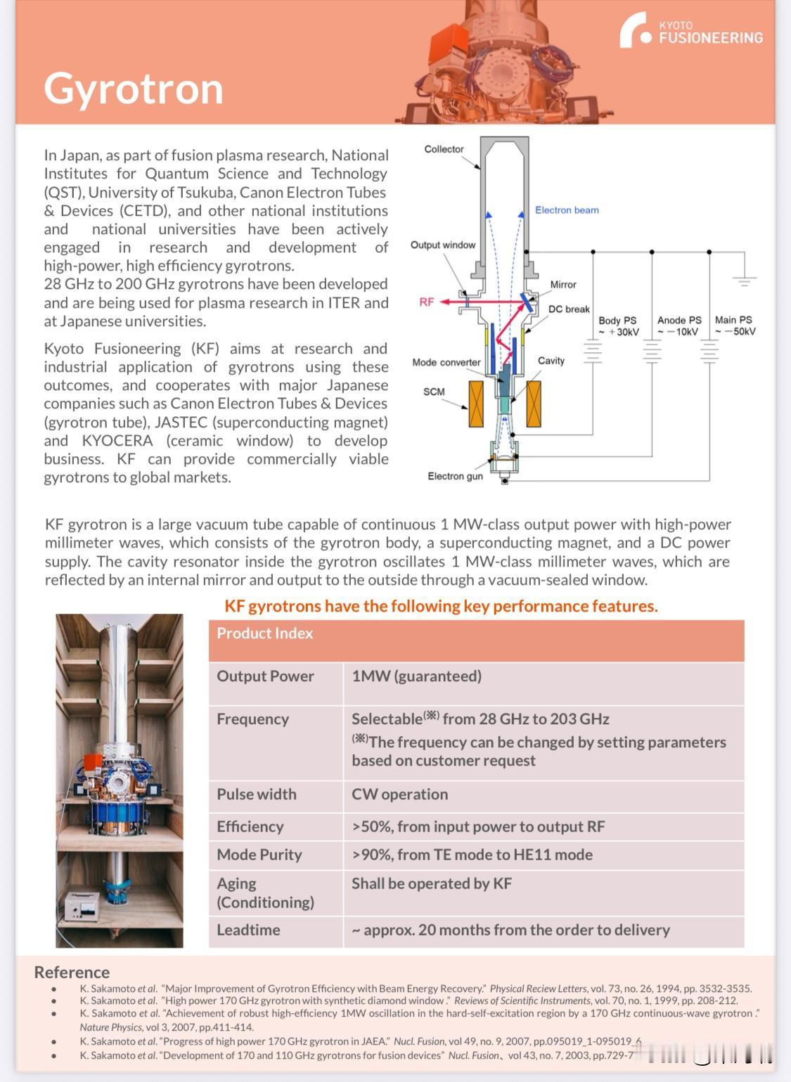 中美聚焦的核聚变技术,砸下万亿资金,各种初创企业这几年纷纷创立。但这项技术中,涉及到一个叫做Gyrotron(回旋管)的设备,目前只有日本的产品最具竞争力。 回旋管(Gyrotron)作为受控核聚变中为等离子体提供微波加热的关键核心器件,其技术壁垒极高,确实表现出高度的市场集中度。日本在该领域处于世界顶尖水平,但并非“唯一”能造的国家。 目前全球范围内能够研制和生产兆瓦级(MW)高性能回旋管的主要厂商分布如下: 1. 日本厂商(世界领先水平) 日本在回旋管的功率、效率和持续运行时间上长期保持优势。 佳能电子管器件株式会社 (Canon Electron Tubes & Devices):前身为东芝电子管,是全球最核心的回旋管供应商之一。 Kyoto Fusioneering:一家来自京都大学的初创企业,专注于聚变工程集成。他们与佳能等巨头合作,向包括英国 Tokamak Energy 在内的全球聚变初创公司提供商业化的回旋管系统。 2. 其他国际核心厂商 除了日本,俄罗斯、美国和欧洲也拥有成熟的生产能力,并共同参与了国际热核聚变实验堆(ITER)的设备供应: 俄罗斯 (Gycom):回旋管的发明地,其 Gycom 公司一直处于技术前沿。 欧洲 (Thales):法国泰雷兹集团是欧洲唯一能够制造高性能回旋管的企业,曾在 Wendelstein 7-X 仿星器项目中创下等离子体加热的世界纪录。 美国 (CPI):Communications & Power Industries (CPI) 是美国主要的回旋管制造商。 3. 中国的研发现状 中国在回旋管领域起步较晚,曾长期依赖进口。但随着“华能”、“中科院”等机构的投入,目前已取得重要突破: 中科院合肥物质科学研究院(等离子体物理研究所):在为全超导托卡马克(EAST)研制国产兆瓦级回旋管,并已实现初步国产化替代。 中电科(CETC)相关研究所:在毫米波、太赫兹真空电子器件领域具有深厚储备,是国产回旋管研发的中坚力量。 虽然日本公司(如佳能)在商用化和高性能稳定性上极具竞争力,但从技术主权角度看,美、俄、中、欧均具备独立的研发和制造能力,以避免在这一战略能源领域被单方面“卡脖子”。