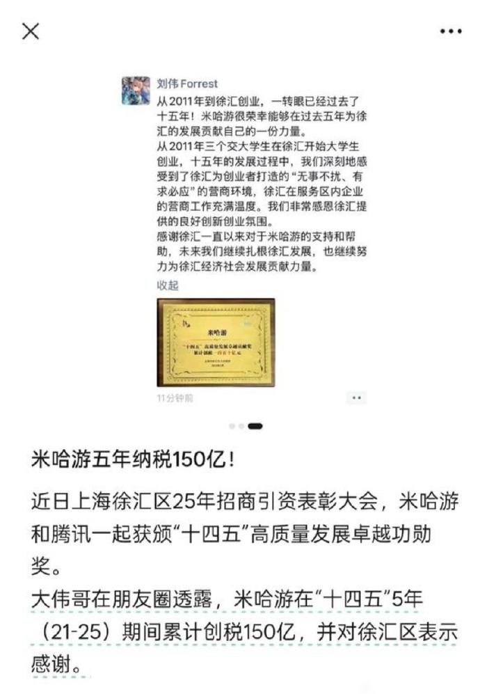 米哈游联合创始人刘伟近日在社交平台透露,公司获得上海市徐汇区政府颁发的“十四五”高质量发展卓越贡献奖,累计创造税收达150亿元。刘伟表示,感谢徐汇区提供的优良创新环境,未来米哈游将继续立足徐汇,为区域经济发展贡献力量。(新浪科技)