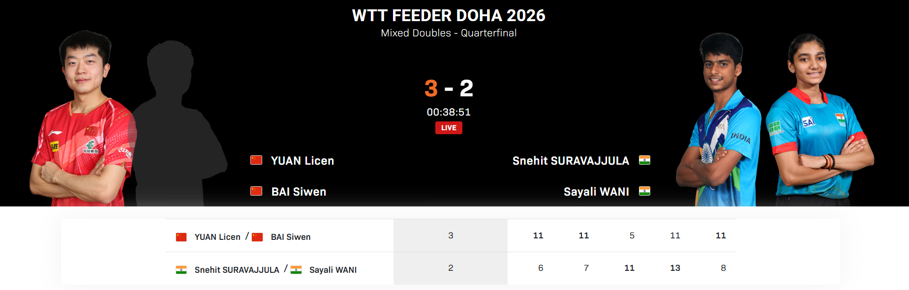 2026WTT支线赛多哈站混双,袁励岑/白思文3-2战胜印度组合苏拉瓦朱拉/瓦妮,晋级四强。比分:11-6、11-7、5-11、11-13、11-8。