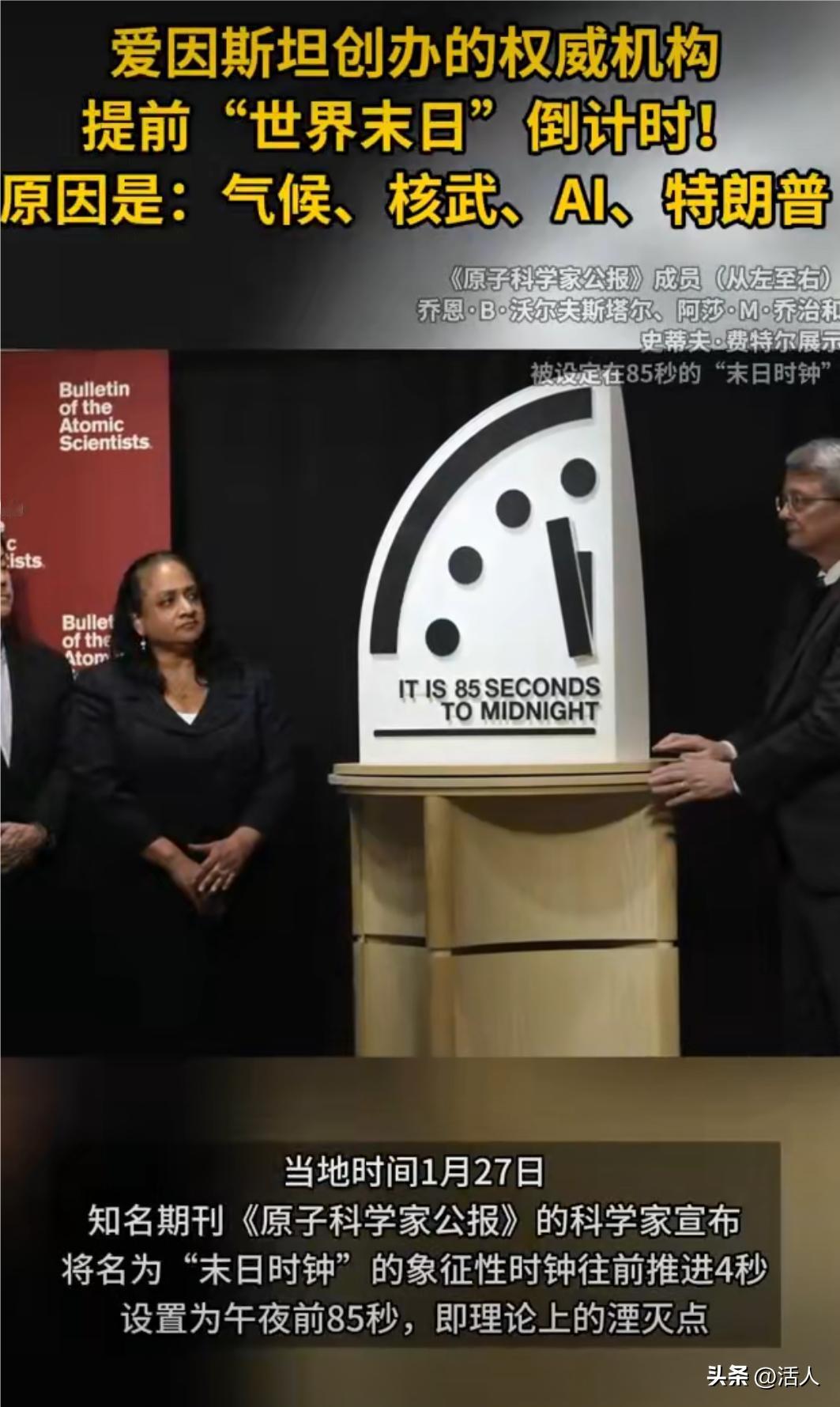 末日时钟调至79年最危险 1月27日,爱因斯坦等科学家创办的《原子科学家公报》,把象征人类生存危机的“末日时钟”拨快4秒,调到午夜前85秒,创下79年设立以来最接近“世界终结”的纪录。如今这时钟不只看核威胁,还涵盖气候、AI、生物技术等多重危机。美俄核军控条约将到期、极端天气频发、AI无监管被滥用,再加上全球合作破裂,多重风险推高了危机。不过这不是定数,机构呼吁各国理性合作,共解生存挑战。