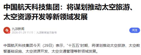就在刚刚, 中国航天科技集团正式宣布, 1月29日,中国航天科技集团正式宣布:“十五五”时期(2026年至2030年)将统筹推进太空旅游、太空数智基础设施、太空资源开发,以及太空交通管理等新兴领域。 大家要清楚,中国计划在未来五年推进太空旅游发展,这意味着在与美国展开激烈技术竞赛的背景下,北京正加快布局商业航天和深空探索。 普通人以前想上太空,那纯属做梦,现在看来,再过几年还真有可能实现,而且不是那种蜻蜓点水的体验,是正儿八经的太空漫游。美国那边的商业航天公司,比如SpaceX、蓝色起源,早就开始搞太空旅游了,票价虽然比中国便宜点,但体验时间短,安全性也没中国这么有兜底。 中国商业太空旅游的首飞时间都定死了,就在2028年,而且现在都已经有20多张船票被人抢着预定了。票价大概在2000万到3000万之间,看着贵得离谱,但对比国际同类项目其实挺实在——美国维珍银河的飞行才11分钟,失重也就2到3分钟,中国的飞行时长能到90分钟,失重体验能有3到5分钟,还能通过1.2米的全景舷窗360度看地球和太空,这体验感直接拉满。更关键的是,飞船是在神舟飞船基础上改的,复用率能到80%,比国际同类项目还高15个百分点,安全这块有国家载人航天体系兜底,放心得很。 别以为推进太空旅游只是让有钱人去太空兜圈,背后没点硬家伙根本玩不转,这就不得不提“十五五”要搞的太空数智基础设施。简单说就是在太空建一个超级大机房,还是吉瓦级的,把地上的云计算、边缘计算和太空的算力、存力全连起来,不管是地上的数据往太空传,还是太空的数据回地面,处理起来都又快又稳。以后不管是太空旅游的实时通信,还是深空探测的数据分析,都得靠这套系统撑着,这也是跟美国掰手腕的关键——美国现在也在抢着建太空互联网,中国要是慢了,以后在太空领域的话语权就会被削弱。 搞定了太空的通信和算力,下一步自然要琢磨太空里的宝贝,也就是太空资源开发。中国探月工程总设计师早就说了,咱们要走“三步走”,2030年前就要能勘探深空资源,还得在月球上搞原位资源利用试验。比如月球上的氦-3,是超级清洁能源,地球上少得可怜,月球上一抓一大把;还有小行星上的铁、镍、稀土这些矿产,价值高得难以想象。“十五五”期间会启动“天工开物”重大专项,专门攻克小行星勘查、智能开采、低成本运输这些技术,以后不用再靠地球资源“过日子”,太空就能给地球“供血”。 太空里的活儿越来越多,卫星、飞船、空间站扎堆,难免会有碰撞风险,这就需要一套规矩来管着,太空交通管理也就成了必选项。现在太空里的碎片越来越多,随便一块小碎片,撞上卫星都能造成毁灭性后果。“十五五”期间,中国会重点攻关太空碎片的监测、预警和清除技术,以后哪些卫星能用哪个轨道,碎片来了怎么规避,都有一套明确的管理办法。更重要的是,现在国际上还没有统一的太空交通规则,中国提前布局,就是要在规则制定中争取主动权,不让美国说了算——美国现在也在搞太空交通管理,还想拉着盟友搞“小圈子”,中国必须提前发力,守住自己的太空权益。 可能有人会说,搞这些项目花钱又费力,不如把钱花在地上。但大家要明白,航天领域的技术突破,最后都会惠及普通人。比如太空育种的蔬菜,长得又大又有营养,早就端上了咱们的餐桌;太空制药技术成熟后,很多疑难病症的治疗成本都会降低。而且在中美技术竞赛的大背景下,航天领域要是落后了,就会被美国卡脖子,就像以前芯片领域那样。“十五五”这五年,中国航天把这四个领域抓牢了,不仅能让普通人的太空梦照进现实,更能在全球航天格局中站稳脚跟,不用再看别人的脸色行事。 现在美国的商业空间站计划也在紧锣密鼓推进,Vast Space公司打算2026年5月就发射第一座商业空间站,抢着占近地轨道的资源。中国自然不能落后,“十五五”这一系列布局,看似是推进几个新兴领域,实则是在下一盘大棋——既要让商业航天能赚钱、能可持续发展,又要在深空探索中掌握核心技术,还要在国际太空规则制定中拥有话语权。等到2030年“十五五”结束,咱们普通人或许真的能看到太空旅游航班常态化,月球资源开发有实质性突破,中国航天也能真正从航天大国变成航天强国,跟美国平起平坐甚至实现超越。