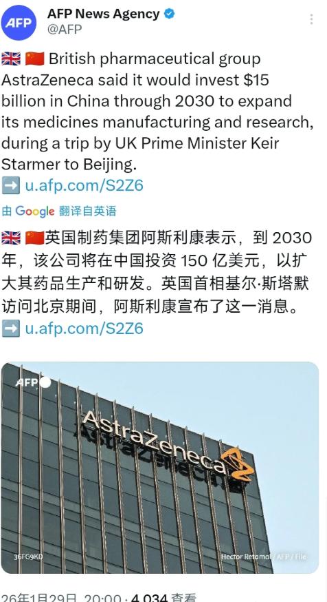 英国宣布了一条或让特朗普恼羞成怒的新闻!1月29日,英国制药集团阿斯利康表示,到2030 年,该公司将在中国投资150亿美元,以扩大其药品生产和研发。 阿斯利康宣布的这150亿美元投资,可不是一笔小数目,折算成人民币都超过1000亿了。 很多人可能对阿斯利康不太了解,其实这家企业跟中国的渊源早就很深了,从1993年进入中国市场开始,它在中国已经深耕了三十多年,之前就已经累计投资超过50亿美元。 2025年10月的时候,它在北京的第六大全球战略研发中心就已经启用了,当时就投资了25亿美元,专门搞人工智能和数据科学相关的药物研发。 这次追加投资,说白了就是阿斯利康看透了中国市场的潜力,也看清了当下的国际形势,要知道,中国现在可是生物医药领域的重要力量,不仅有完善的产业链,还有庞大的市场需求,更重要的是,中国一直坚持扩大开放,给外资企业提供了很好的发展环境,2024年的时候,“创新药”还首次写入了中国的政府工作报告,足以看出中国对这个领域的重视。 更有意思的是,阿斯利康的这笔投资,选在斯塔默访华期间宣布,背后的深意可不简单。 这不仅仅是一家企业的商业选择,更像是英国政府释放的一个明确信号——英国要重启对华合作,要跟中国好好打交道,不再跟着美国盲目反华,毕竟现在的英国,经济压力也不小,跟中国合作,才能找到新的发展机遇。 可能有人会问,阿斯利康投这么多钱,到底能得到什么? 其实答案很简单,双赢,对阿斯利康来说,中国的研发实力和生产能力能帮它加速新药研发,缩短转化周期,还能借助中国的市场实现更好的发展。 截至2025年,它在中国的研发管线已经有200多个项目,每年还会新增10到15个,跟全球完全同步。对我们中国来说,这笔投资更是好处多多。 不仅能带动相关产业的发展,升级我们的药品生产和研发水平,让中国患者能更快用到全球前沿的新药;还能创造大量的就业岗位,按照规划,阿斯利康在中国的员工规模会超过2万人,能新增数千个岗位。 而且这并不是西方企业第一次加码对华投资,最近一段时间,很多西方国家的领导人都扎堆来中国访问,爱尔兰、加拿大、芬兰这些国家都来了。 说白了,大家心里都跟明镜似的,现在的世界,单打独斗根本不行,想要发展经济、应对各种全球挑战,跟中国合作才是唯一的正确选择。 之前美国一直想方设法拉拢盟友,打压中国,试图阻止各国跟中国合作。可英国这次直接“反水”,阿斯利康砸下150亿美元,就是最好的证明——没有哪个国家会愿意为了迎合美国,放弃自己的发展机遇。 特朗普一直把中国当成“对手”,可他没想到,自己的盟友居然一个个都跟中国走近,这换谁能不生气? 阿斯利康的这笔投资,也给其他外资企业做了一个很好的榜样,它用实际行动证明,中国市场不仅值得投资,而且能带来实实在在的回报。 这些年,阿斯利康在中国推出了40多款创新药,覆盖肿瘤、心血管、罕见病等多个领域,还跟近500家医院开展了160多个临床项目,真正做到了跟中国同发展、共进步。 说到底,斯塔默访华期间,阿斯利康宣布150亿美元投资,不仅仅是一笔商业投资,更是中英两国深化合作的一个重要信号。 它告诉全世界,中英两国之间,有很多共同的利益,有很大的合作空间,只要双方相互尊重、平等互利,就能实现双赢,就能共同开启中英关系健康稳定发展的新篇章。 现在的中国,正以开放包容的姿态,欢迎全世界各国前来合作,我们不搞霸权,不搞对抗,只希望跟各国一起,携手应对各种挑战,共同推动世界经济发展。 大家对此有什么看法呢?欢迎各位在评论区留言!