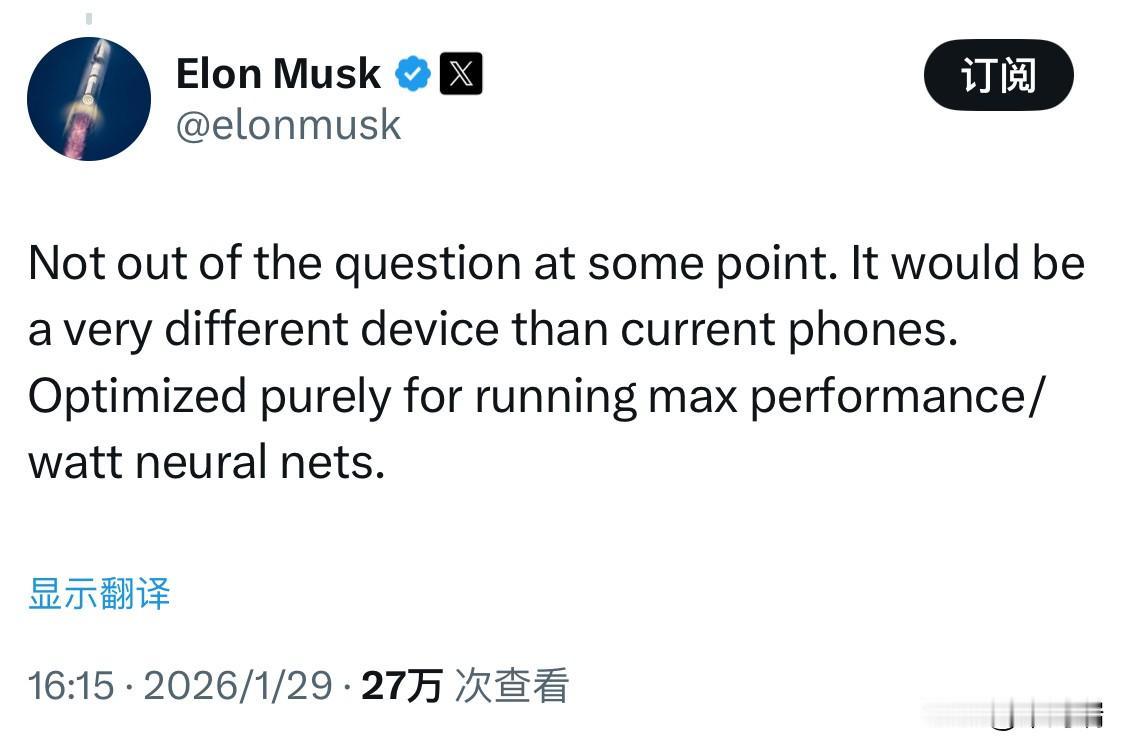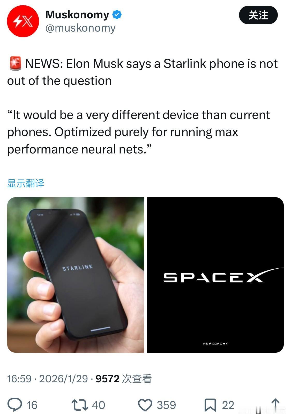 埃隆·马斯克最近在社交平台 X 上明确表示,未来推出“星链手机(Starlink Phone)”并不是没有可能。 根据他的描述,这款设备将与传统的 iPhone 或安卓手机有本质区别: 神经网络优化:该设备将完全针对运行最高性能/瓦特比的神经网络进行优化。这意味着它可能深度集成马斯克旗下的 xAI 技术,专注于高效的本地人工智能运算,而非仅仅是传统的移动应用。 卫星直连能力:虽然马斯克曾多次否认正在研发“特斯拉手机(Tesla Pi Phone)”,并表示除非苹果或谷歌进行恶意封杀否则无意入场,但他对“星链手机”的松口暗示了其对 SpaceX 旗下 Starlink Direct to Cell(星链直连手机)业务的硬件延伸考虑。 目前,SpaceX 已经推出了针对普通 LTE 手机的 Direct to Cell 服务,无需更改现有硬件即可实现卫星短讯、语音和数据传输。而马斯克所设想的这款新设备,可能是一款专门为这一生态打造的、主打 AI 性能的全新终端。 需要注意的是,目前市场上流传的所谓“Tesla Pi”手机渲染图及“789美元”等具体价格多为虚假信息或民间猜测,特斯拉和 SpaceX 尚未发布官方产品计划。