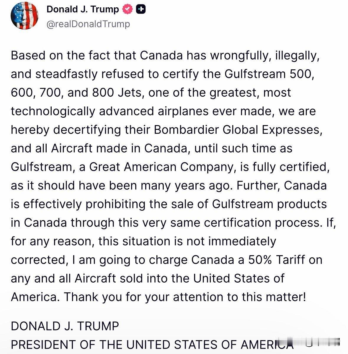 “真相社交”突发消息:特朗普取消所有加拿大制造飞机的认证,威胁加征50%关税。