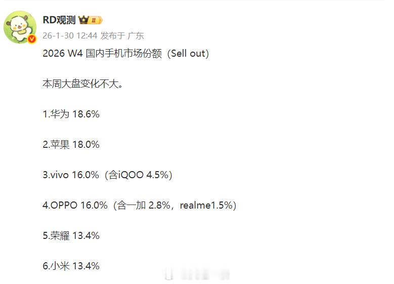 3、有意思的是vivo与OPPO的份额完全相同,荣耀与小米的份额完全相同。