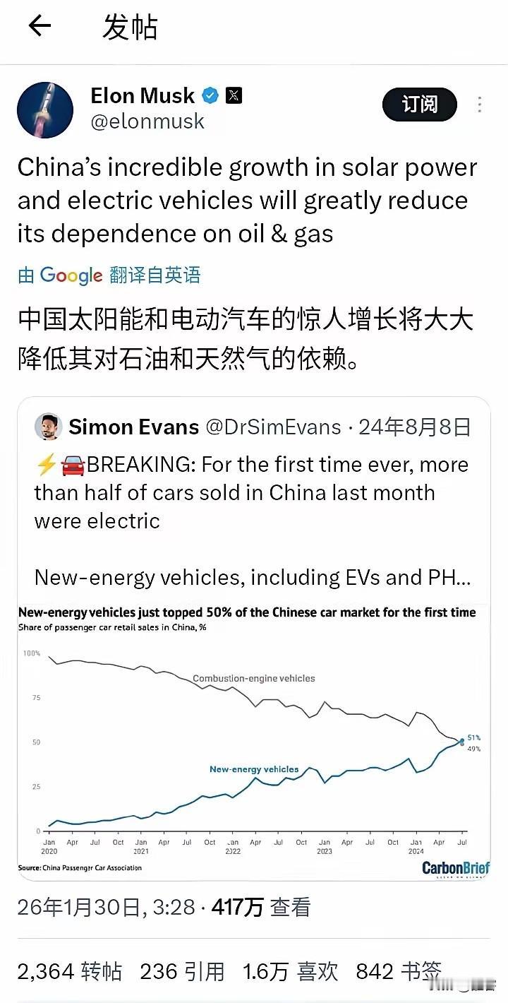 中国在2024年7月新能源汽车销售就超过了燃油汽车,现在又被马斯克拿来炒作,无非就是渲染他关于太空算力的概念。 历史性突破:2024年7月,新能源汽车市场份额首次超过50%,达到51%,而燃油车降至49%。这标志着新能源汽车正式成为中国汽车市场的主流。 新能源汽车(蓝色曲线) • 2020年初:起步较低,市场份额仅约5-8%。 • 稳步上升:经历三年多的持续增长,期间虽有小幅波动(如2022年底、2023年底的短暂回调),但整体上升趋势明显。 • 加速期:2024年以来增长迅猛,从约35%快速攀升至51%。 燃油车(灰色曲线) • 2020年初:占据绝对优势,约95%左右。 • 持续下滑:呈现明显的下降趋势,从2020年的约95%一路跌至2024年7月的49%。 • 跌破50%:2024年7月首次失去市场主导地位。 近日多家媒体29日报道,马斯克正考虑整合旗下资产,从而推进太空算力布局。报道称,马斯克在太空部署人工智能数据中心的设想将可能通过上述不同路径实现。如果工程技术允许,其中一个方向是,太空探索技术公司在轨数据中心将为xAI输送庞大算力。另一个方向是,特斯拉制造储能系统的能力,将可帮助太空探索技术公司在太空利用太阳能运行这些数据中心。