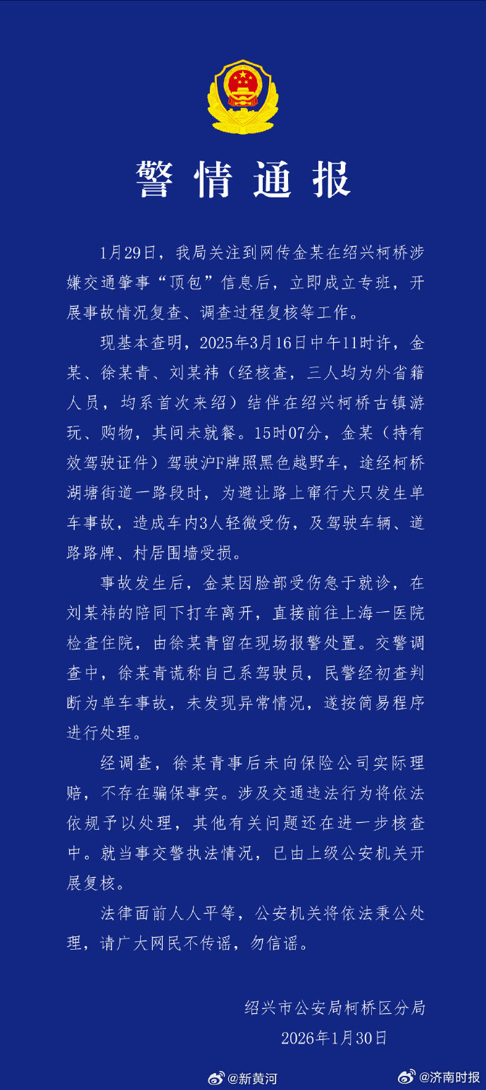 【#金晨所涉交通事故不存骗保行为# 】#警方通报金晨事件# 1月30日,通报网传金晨涉嫌交通肇事“顶包”,称2025年3月16日金某驾驶黑色越野车,为避让路上窜行犬只发生单车事故,造成车内3人轻微受伤,及驾驶车辆、道路路牌、村居围墙受损。事故发生后,金某因脸部受伤急于就诊,在刘某陪同下打车离开,由徐某留在现场报警处置。“徐某青谎称自己系驾驶员”,事后未向保险公司实际理赔,“不存在骗保事实。”#金晨回应被曝肇事逃逸#