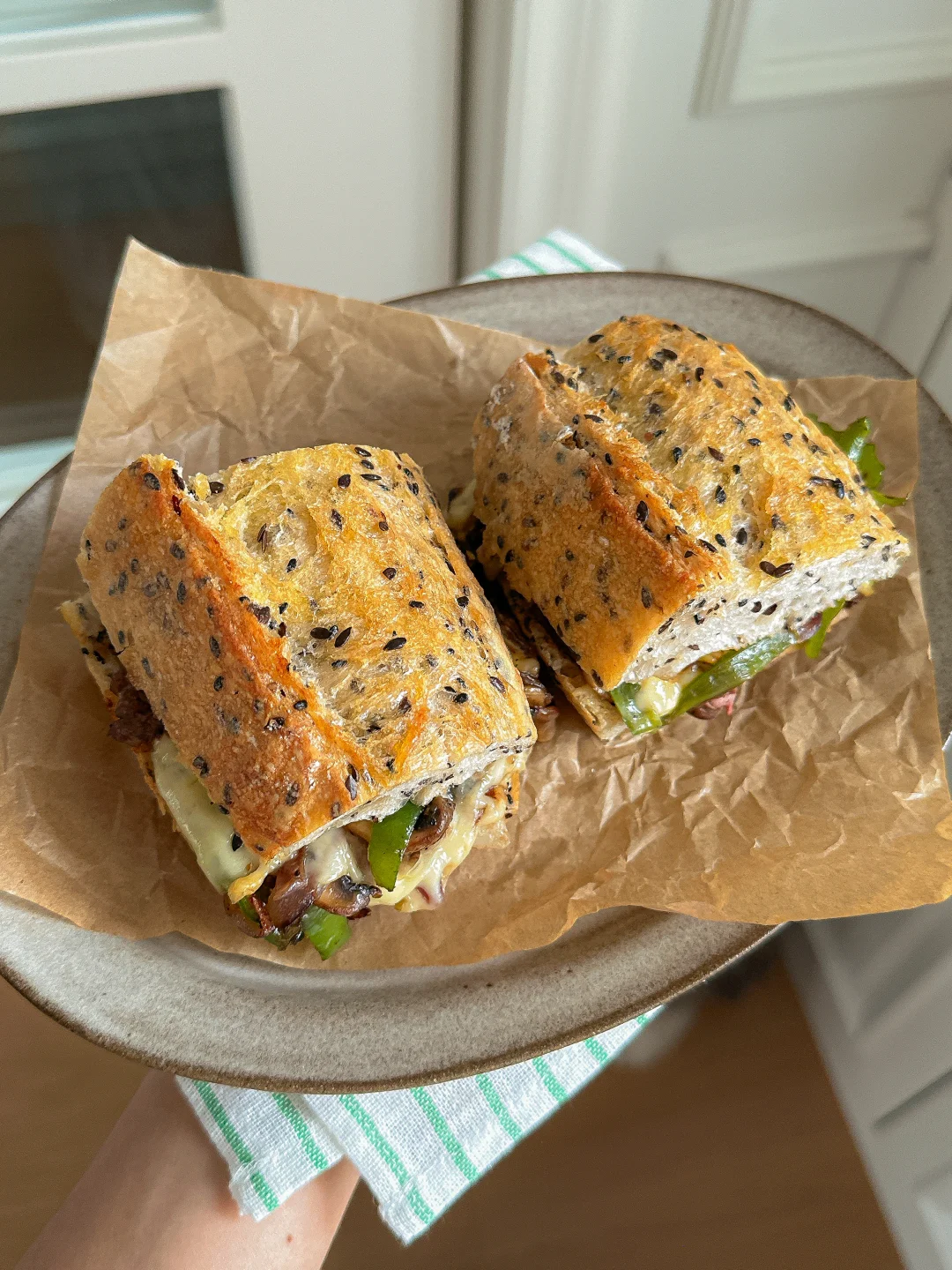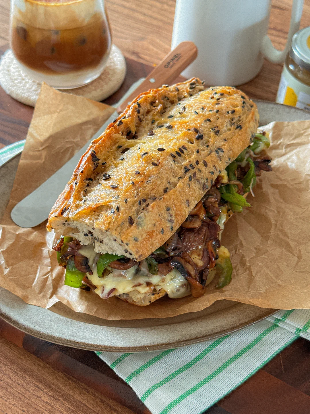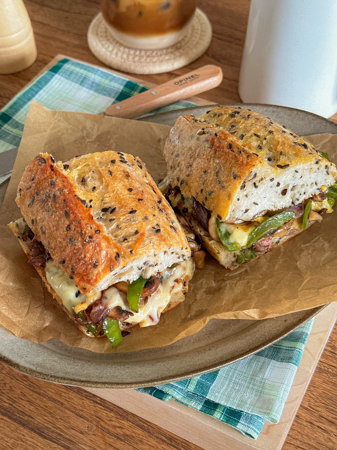 最近迷上这种烤得焦脆外壳的粗粮法棍🥖 内里是有嚼劲 韧韧湿润的口感~ 口蘑的菌菇香气:牛肉的焦香辣 再铺会拉丝的芝士片➕奶香 扎实的口感 一定要试试! - 亚麻籽的颗粒感让整个三明治更有层次 整体咸香浓郁~保证吃上一口就爱上! 是健康又hin稳定食欲的一餐🍴