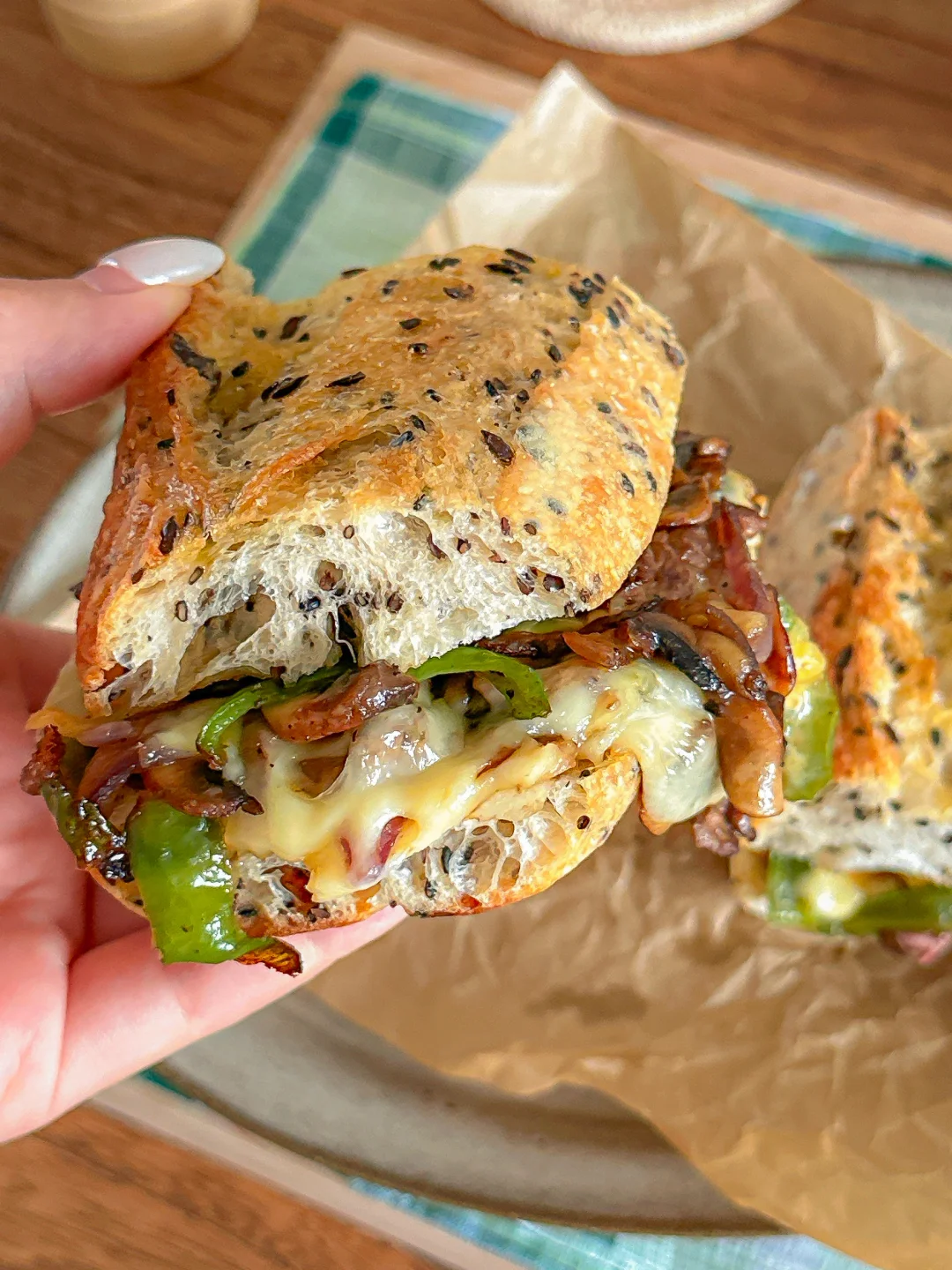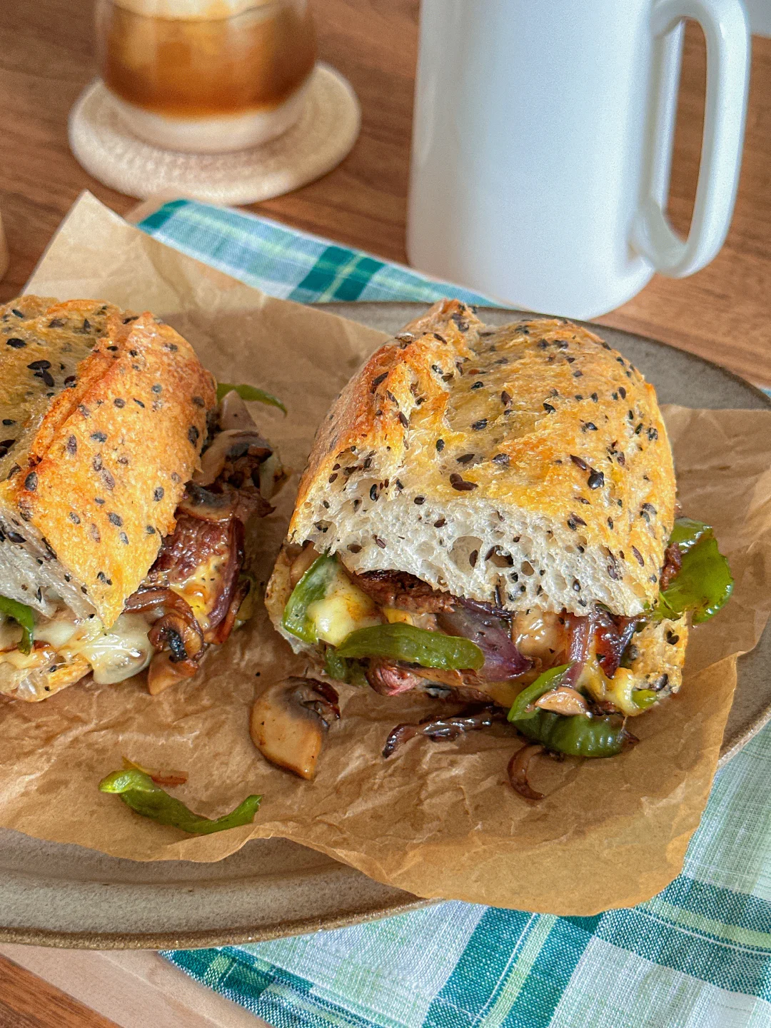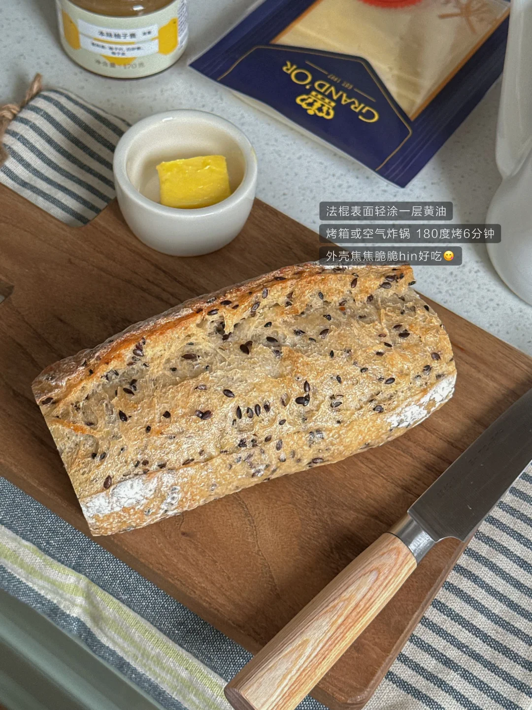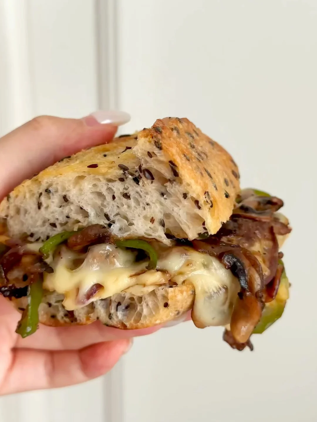 最近迷上这种烤得焦脆外壳的粗粮法棍🥖 内里是有嚼劲 韧韧湿润的口感~ 口蘑的菌菇香气:牛肉的焦香辣 再铺会拉丝的芝士片➕奶香 扎实的口感 一定要试试! - 亚麻籽的颗粒感让整个三明治更有层次 整体咸香浓郁~保证吃上一口就爱上! 是健康又hin稳定食欲的一餐🍴