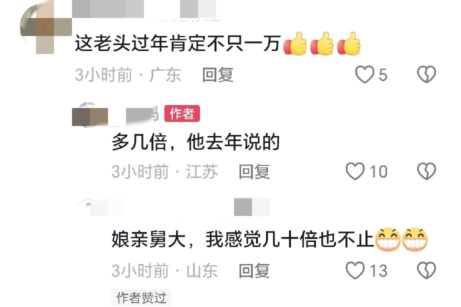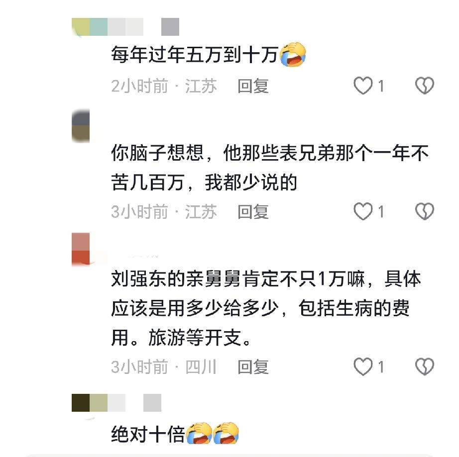 刘强东好给力,给大舅和大舅妈发的红包比普通村民多几倍,大舅一家住别墅,表兄妹全部跨越了阶层! 1月28日,刘强东的老家江苏宿迁光明村热闹非凡,原因是刘强东给村民发的春节物资陆续到了,很多人都已经开始领了,还有现金红包。 村里每位60岁以上的老人有1万现金,如果两口子都超过60岁就是2万,有的家庭已经连着领了好几年了。 有一个女孩跑到光明村打卡,手机没电了就随机进了一家农户,结果发现是刘强东的大舅家。 只见刘强东的大舅和大舅妈住在一栋小别墅里,有好几年了,二人虽然老了,但精气神却很好,如今他们不上班就是在享受生活。 大舅悄悄透露,刘强东发给他们的红包和物资要比普通的村民多几倍,毕竟刘强东小的时候,经常在大舅家里吃饭写作业,其两个妹妹也一样,大舅给了他们很多照顾。 而且,舅舅家的这一门亲人是刘强东的母亲那一波的,有更亲近的血缘关系,发物资的时候肯定给他们多发一些。 知情人爆料,单说1万的现金红包这事,别的村民是1万,而刘强东的大舅家就是几万,5~10万吧。 这么说来,刘强东真是太大方了,不仅给毫无血缘关系的陌生人发红包,给自己的亲人发的红包更多一些,也算是尽孝了。 知情人还透露,刘强东的大舅一家人,只有大舅和大舅妈不上班,其家里的年轻人都在京东上班,他们全部都跨越了阶层。 而看了刘强东大舅和大舅妈的模样,感觉大舅和刘强东的脸型长得特别像的,果然外甥就是像大舅!