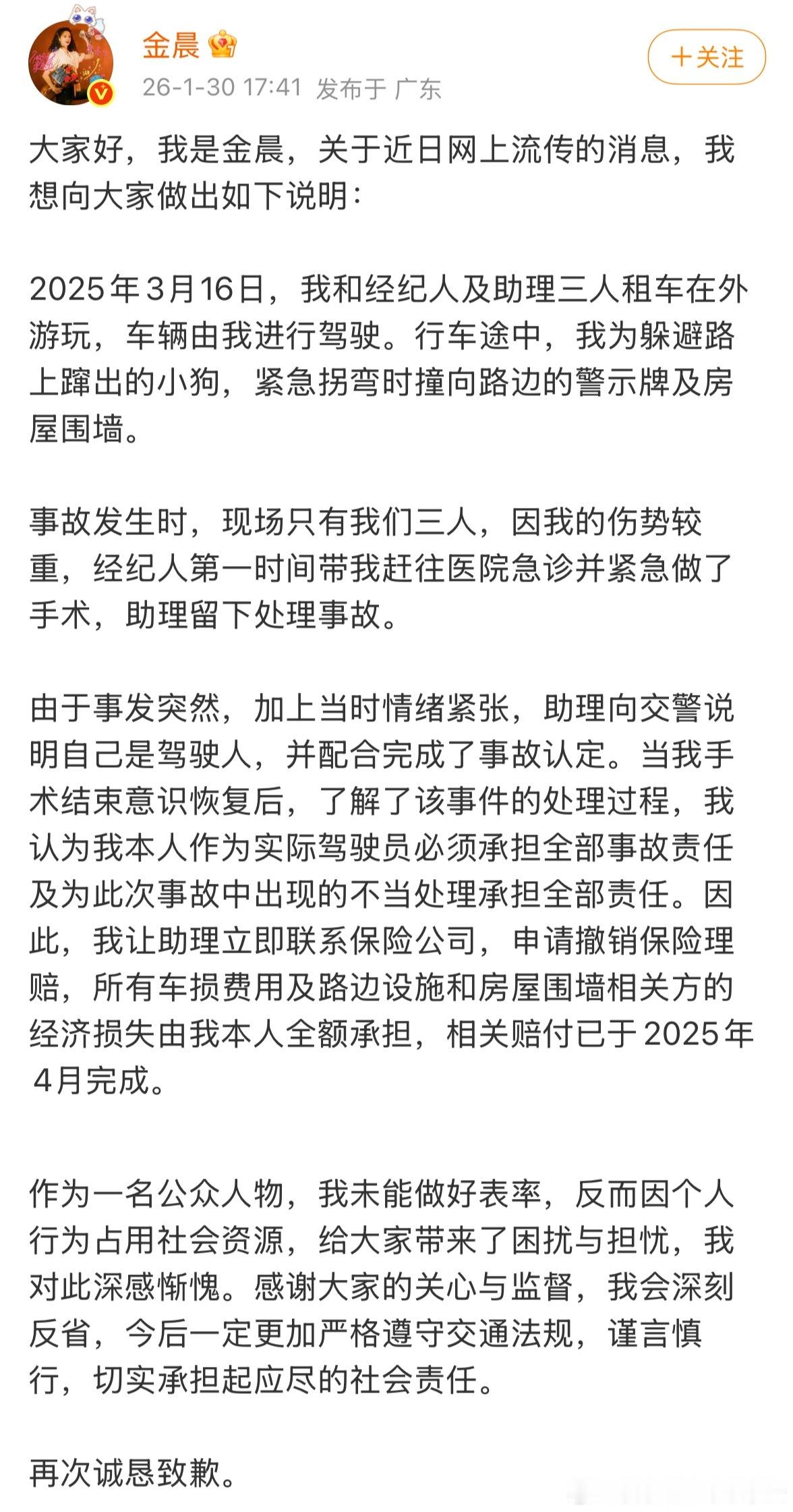 警方通报金晨交通事故详情:2025年3月16日金某驾驶黑色越野车,为避让路上窜行犬只发生单车事故,造成车内3人轻微受伤,及驾驶车辆、道路路牌、村居围墙受损。事故发生后,金某因脸部受伤急于就诊,在刘某陪同下打车离开,由徐某留在现场报警处置。“徐某青谎称自己系驾驶员”,事后未向保险公司实际理赔,“不存在骗保事实。”