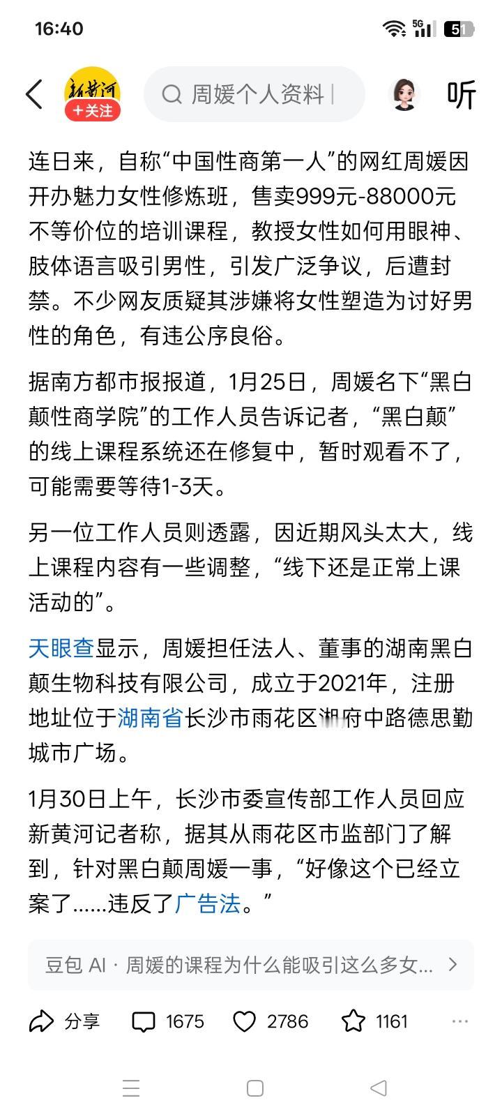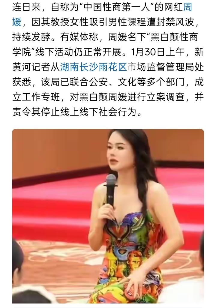 “性商”是什么? 如果不是看手机,还真不知道社会中还有“性商”这么一个词。并且自认为“中国性商”第一人的湖南女子周媛,已经被有关部门禁止线上线下的营销活动。但是,周媛名下创建的“黑白颠性商学院”,好像仍然在继续进行线下的营销活动,并没有完全、彻底的停止。 所谓的“性商”,从介绍的网文中了解到,就是教授女性使用眼神和肢体语言讨好、或引起男人们的注意,如果说就是勾引男人们,估计意思也差不多。 如果从中性的立场看待这种情况,似乎也并没有什么特别值得关注的问题,但问题的关键是动机。为什么女人要学习要掌控使用眼神和肢体语言讨好、或者勾引、引起男人们注意?这显然不是技巧的问题,而是目的和动机的事情。如果你用眼神和肢体语言讨好、勾引的是你亲爱的正在恋爱对象或亲爱的老公,估计应该是没有什么问题。但假如是怀不可告人的目的,比如为了获得不义之财,去讨好或勾引男人,恐怕就不可理喻了。而一般的女性,在社会的正常交往的情况下,似乎也没有必要掌握利用眼神和肢体语言讨好或勾引男人的技巧。 爱美之心人皆有之。