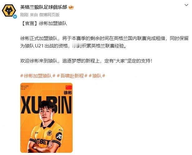 官宣:徐彬正式加盟狼队,将于本赛季的剩余时间在英格兰国内联赛完成租借,同时保留为狼队U21出战的资格,以此积累英格兰联赛经验。