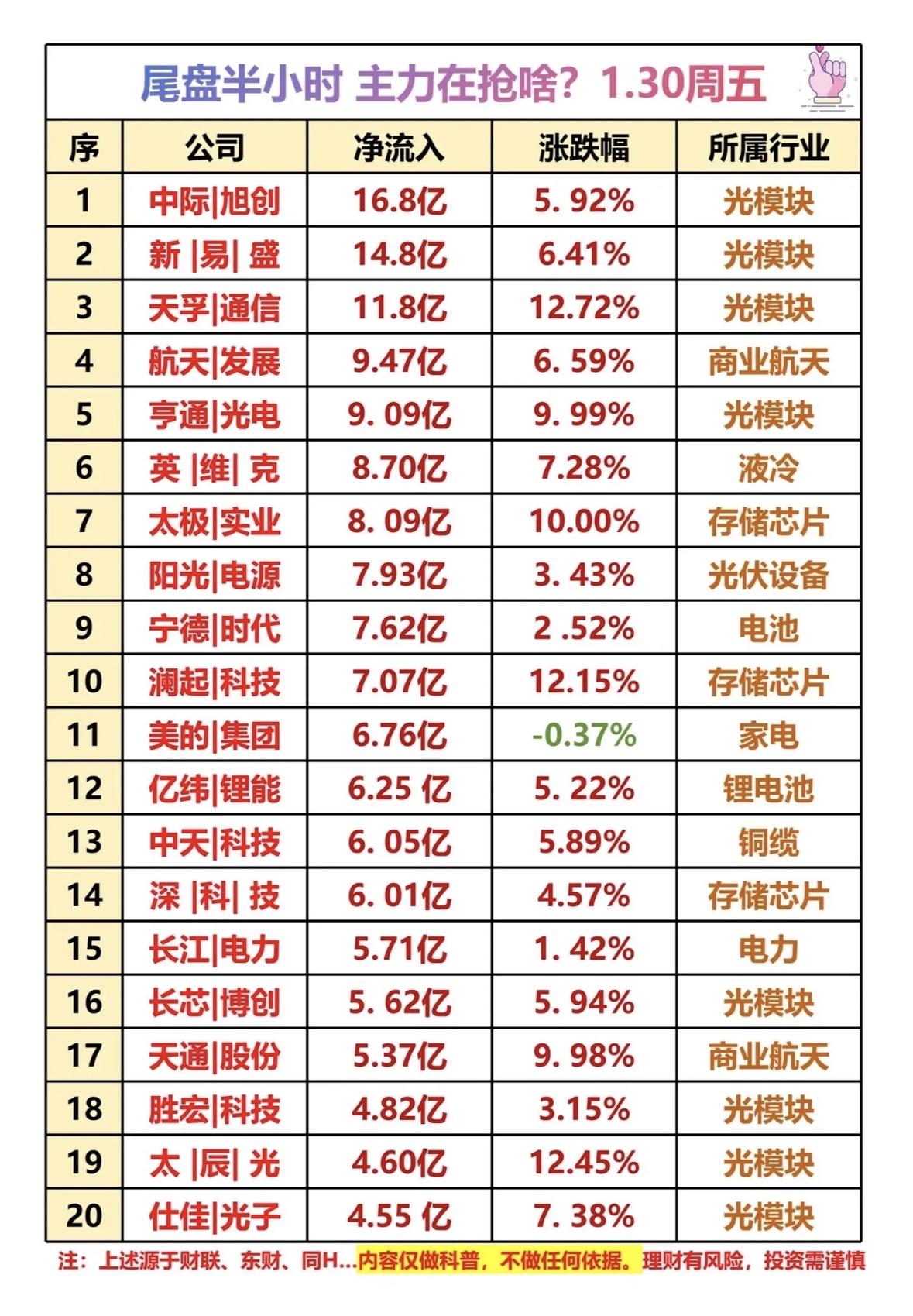 1.30周五尾盘半小时主力抢筹榜,光模块、商业航天、存储芯片等板块强势! 主力尾盘抢筹光模块、商业航天、存储芯片等热门赛道,资金流向显示科技与新能源受青睐。