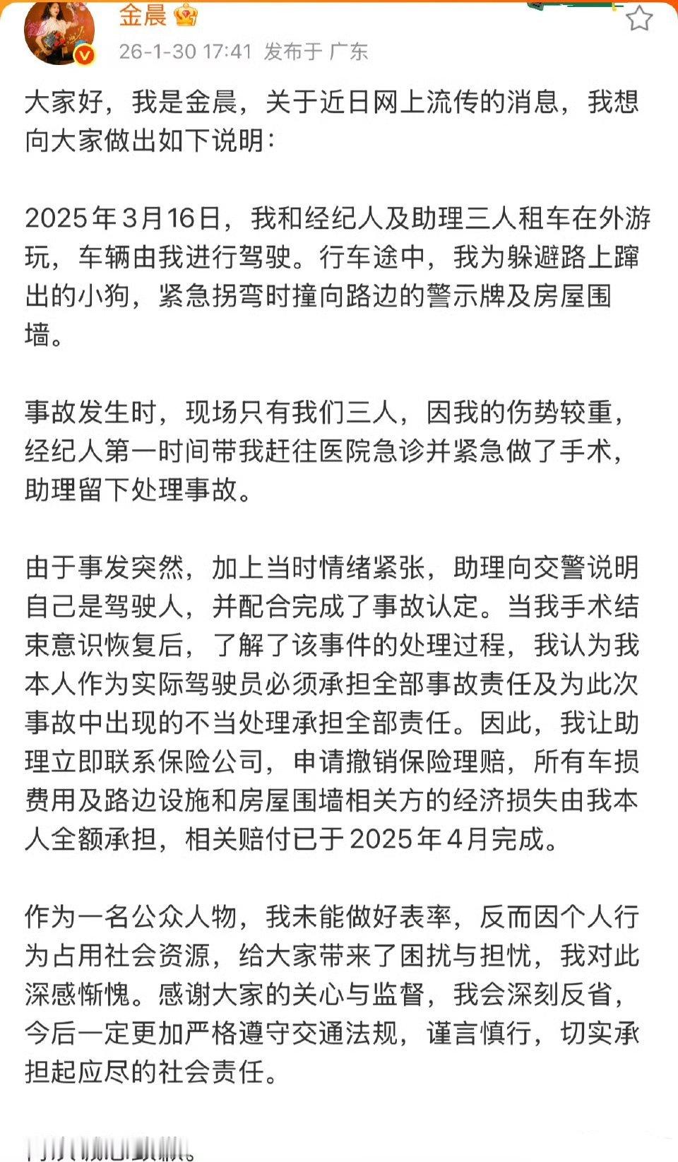 金晨发微博解释道歉了金晨被曝肇事逃逸被撞墙农户已获赔警方通报金晨事件