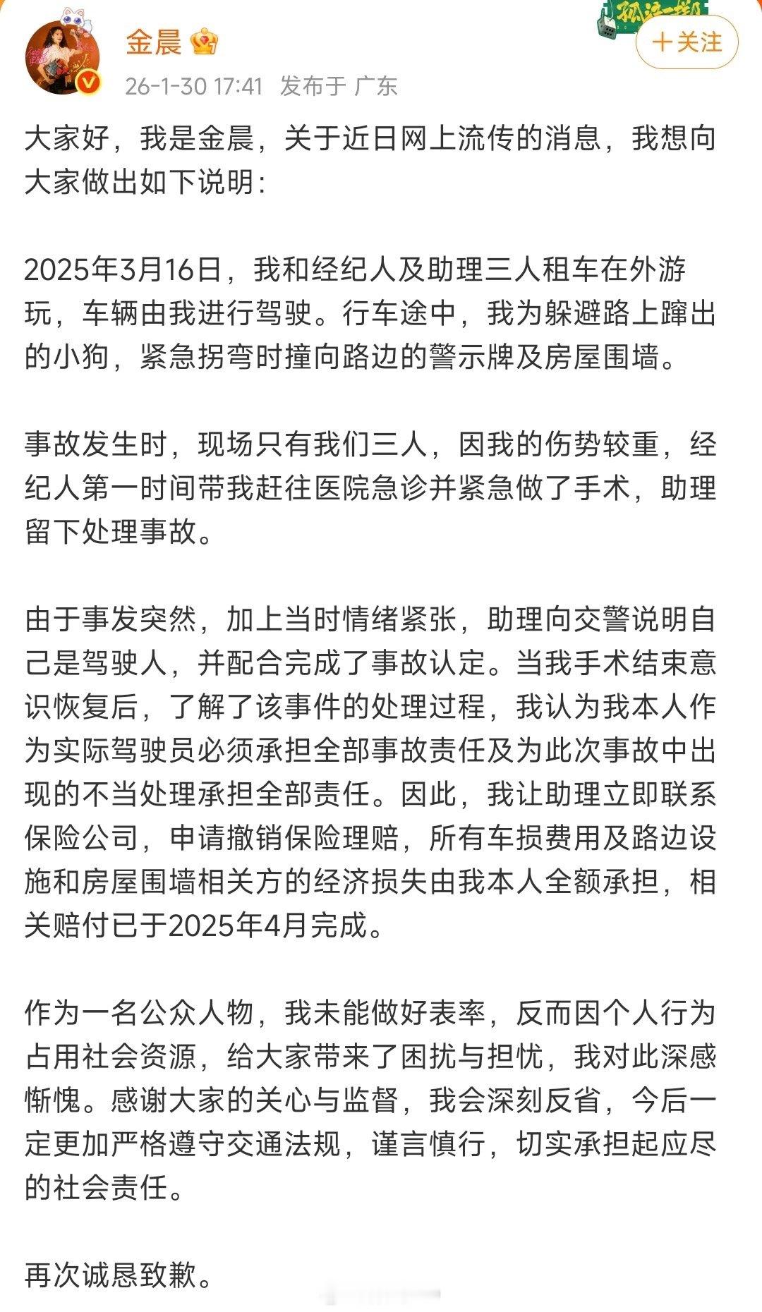 金晨道歉金晨道歉,称相关赔付已于2025年4月完成。金晨:作为一名公众人物,我未能做好表率,反而因个人行为占用社会资源,给大家带来了困扰与担忧,我对此深感惭愧。