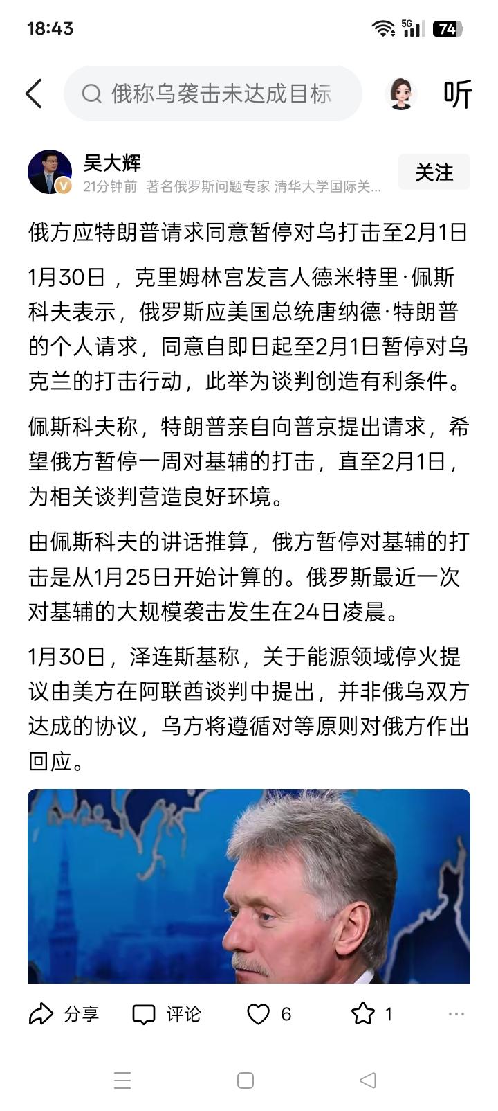 乌克兰2月1日遭特别重大袭击? 因为美国总统特朗普向俄罗斯总统普京表示,由于天气寒冷,请求俄罗斯在一周的时间内,暂停向乌克兰进行的空中袭击。 而有消息说,一周7天的时间是从1月25日开始计算的,那么到1月31日过去,一个星期7天的时间也就结束了。 如此一来,俄罗斯在1月份最后的一个星期里积存的对乌克兰进行空中袭击的导弹和无人机,势必要在暂停袭击的一星期之后的2月1日,全部投向乌克兰?估计袭击主要目标,仍然是乌克兰的供电、供水和供暖的基础设施、设备。 那么,特朗普请求的暂停一个星期的时间的袭击,又有什么实际意义呢?